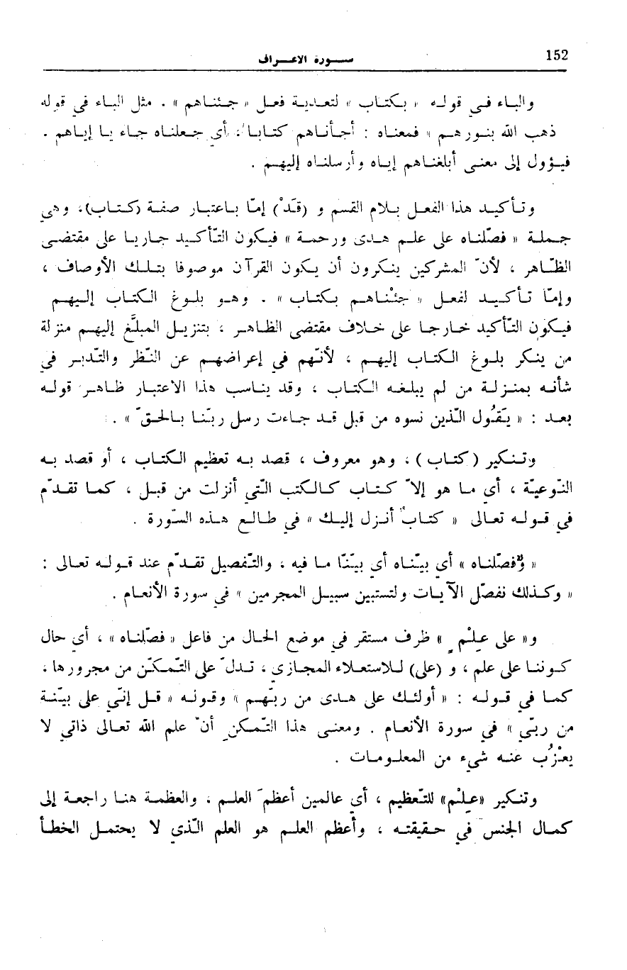 وَتَأْكِيدُ هَذَا الْفِعْلِ بلام الْقسم و (قد) إِمَّا بِاعْتِبَارِ صِفَةِ (كِتَابٍ) ، وَهِيَ جُمْلَةُ فَصَّلْناهُ عَلى عِلْمٍ هُدىً وَرَحْمَةً فَيَكُونُ التَّأْكِيدُ جَارِيًا عَلَى مُقْتَضَى الظَّاهِرِ، لِأَنَّ الْمُشْرِكِينَ يُنْكِرُونَ أَنْ يَكُونَ الْقُرْآنُ مَوْصُوفًا بِتِلْكَ الْأَوْصَافِ، وَإِمَّا تَأْكِيدٌ لِفِعْلِ جِئْناهُمْ بِكِتابٍ وَهُوَ بُلُوغُ الْكِتَابِ إِلَيْهِمْ فَيَكُونُ التَّأْكِيدُ خَارِجًا عَلَى خِلَافِ مُقْتَضَى الظَّاهِرِ، بِتَنْزِيلِ الْمُبَلَّغِ إِلَيْهِمْ مَنْزِلَةَ مَنْ يُنْكِرُ بُلُوغَ الْكِتَابِ إِلَيْهِمْ، لِأَنَّهُمْ فِي إِعْرَاضِهِمْ عَنِ النَّظَرِ وَالتَّدَبُّرِ فِي شَأْنِهِ بِمَنْزِلَةِ مَنْ لَمْ يَبْلُغْهُ الْكِتَابُ، وَقَدْ يُنَاسِبُ هَذَا الِاعْتِبَارُ ظَاهِرَ قَوْلِهِ بَعْدُ: يَقُولُ الَّذِينَ نَسُوهُ مِنْ قَبْلُ قَدْ جاءَتْ رُسُلُ رَبِّنا بِالْحَقِّ [الْأَعْرَاف: 53] .