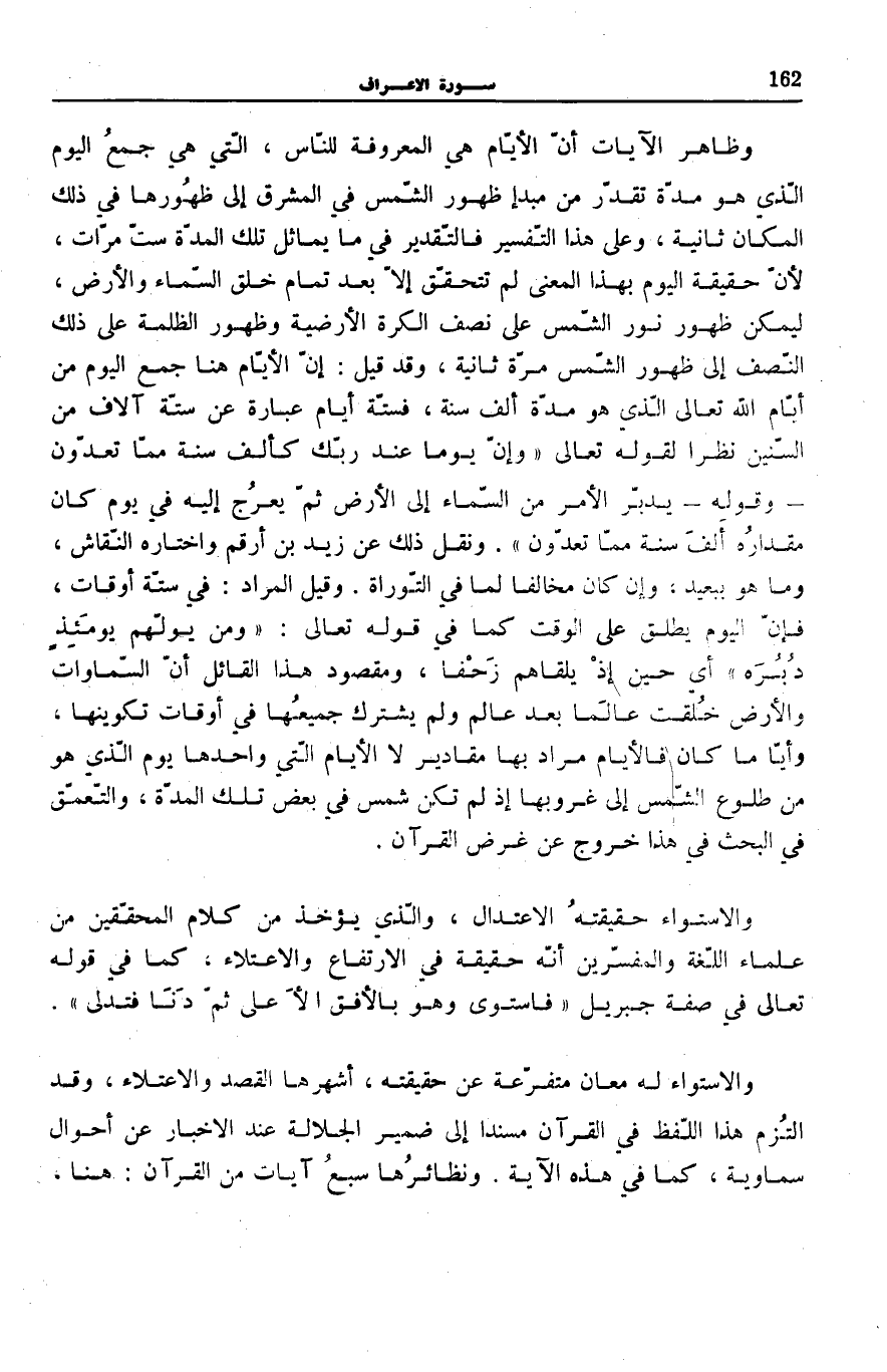وَظَاهِرُ الْآيَاتِ أَنَّ الْأَيَّامَ هِيَ الْمَعْرُوفَةُ لِلنَّاسِ، الَّتِي هِيَ جَمْعُ الْيَوْمِ الَّذِي هُوَ مُدَّةٌ تُقَدَّرُ مِنْ مَبْدَإِ ظُهُورِ الشَّمْسِ فِي الْمَشْرِقِ إِلَى ظُهُورِهَا فِي ذَلِكَ الْمَكَانِ ثَانِيَةً، وَعَلَى هَذَا التَّفْسِيرِ فَالتَّقْدِيرُ فِي مَا يُمَاثِلُ تِلْكَ الْمُدَّةِ سِتَّ مَرَّاتٍ، لِأَنَّ حَقِيقَةَ الْيَوْمِ بِهَذَا الْمَعْنَى لَمْ تَتَحَقَّقْ إِلَّا بَعْدَ تَمَامِ خَلْقِ السَّمَاءِ وَالْأَرْضِ، لِيُمْكِنَ ظُهُورُ نُورِ الشَّمْسِ عَلَى نِصْفِ الْكُرَةِ الْأَرْضِيَّةِ وَظُهُورُ الظُّلْمَةِ عَلَى ذَلِكَ النِّصْفِ إِلَى ظُهُورِ الشَّمْسِ مَرَّةً ثَانِيَةً، وَقَدْ قِيلَ: إِنَّ الْأَيَّامَ هُنَا جَمْعُ الْيَوْمِ مِنْ أَيَّامِ اللَّهِ تَعَالَى الَّذِي هُوَ مُدَّةُ أَلْفِ سَنَةٍ، فَسِتَّةُ أَيَّامٍ عِبَارَةٌ عَنْ سِتَّةِ آلَافٍ مِنَ السِّنِينَ نَظَرًا لِقَوْلِهِ تَعَالَى: وَإِنَّ يَوْماً عِنْدَ رَبِّكَ كَأَلْفِ سَنَةٍ مِمَّا تَعُدُّونَ [الْحَج: 47] وَقَوْلِهِ: يُدَبِّرُ الْأَمْرَ مِنَ السَّماءِ إِلَى الْأَرْضِ ثُمَّ يَعْرُجُ إِلَيْهِ فِي يَوْمٍ كانَ مِقْدارُهُ أَلْفَ سَنَةٍ مِمَّا تَعُدُّونَ [السَّجْدَة: 5] ، وَنُقِلَ ذَلِكَ عَنْ زَيْدِ بْنِ أَرْقَمَ وَاخْتَارَهُ النَّقَاشُ، وَمَا هُوَ بِبَعِيدٍ، وَإِنْ كَانَ مُخَالِفًا لِمَا فِي التَّوْرَاةِ، وَقِيلَ الْمُرَادُ: فِي سِتَّةِ أَوْقَاتٍ، فَإِنَّ الْيَوْمَ يُطْلَقُ عَلَى الْوَقْتِ كَمَا فِي قَوْلِهِ تَعَالَى: وَمَنْ يُوَلِّهِمْ يَوْمَئِذٍ دُبُرَهُ [الْأَنْفَال: 16] أَيْ حِينَ إِذْ يَلْقَاهُمْ زَحْفًا، وَمَقْصُودُ هَذَا الْقَائِلِ أَنَّ السَّمَاوَاتِ وَالْأَرْضَ خُلِقَتْ عَالَمًا بَعْدَ عَالَمٍ وَلَمْ يَشْتَرِكْ جَمِيعُهَا فِي أَوْقَاتِ تَكْوِينِهَا، وَأَيًّا مَا كَانَ فَالْأَيَّامُ مُرَادٌ بِهَا مَقَادِيرٌ لَا الْأَيَّامُ الَّتِي وَاحِدُهَا يَوْمٌ الَّذِي هُوَ مِنْ طُلُوعِ الشَّمْسِ إِلَى غُرُوبِهَا إِذْ لَمْ تَكُنْ شَمْسٌ فِي بَعْضِ تِلْكَ الْمُدَّةِ، وَالتَّعَمُّقُ فِي الْبَحْثِ فِي هَذَا خُرُوجٌ عَنْ غَرَضِ الْقُرْآنِ.