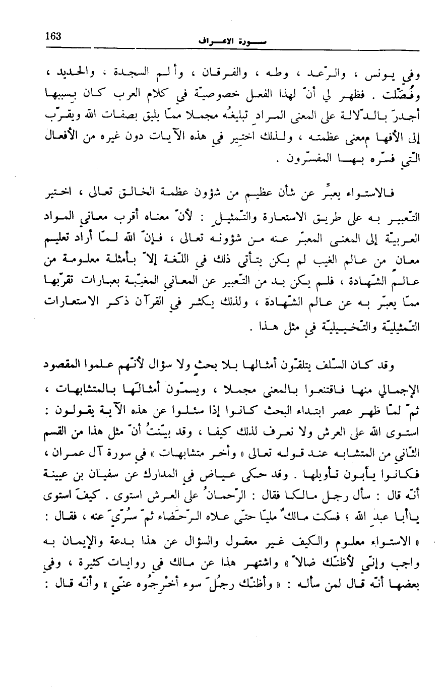 وَقَدْ كَانَ السَّلَفُ يَتَلَقَّوْنَ أَمْثَالَهَا بِلَا بَحْثٍ وَلَا سُؤَالٍ لِأَنَّهُمْ عَلِمُوا الْمَقْصُودَ الْإِجْمَالِيَّ مِنْهَا فَاقْتَنَعُوا بِالْمَعْنَى مُجْمَلًا، وَيُسَمُّونَ أَمْثَالَهَا بِالْمُتَشَابِهَاتِ، ثُمَّ لَمَّا ظَهَرَ عَصْرُ ابْتِدَاءِ الْبَحْثِ كَانُوا إِذَا سُئِلُوا عَنْ هَذِهِ الْآيَةِ يَقُولُونَ: اسْتَوَى اللَّهُ عَلَى الْعَرْشِ وَلَا نَعْرِفُ لِذَلِكَ كَيْفًا، وَقَدْ بَيَّنْتُ أَنَّ مِثْلَ هَذَا مِنَ الْقِسْمِ الثَّانِي مِنَ الْمُتَشَابِهِ عِنْدَ قَوْلِهِ تَعَالَى: وَأُخَرُ مُتَشابِهاتٌ فِي سُورَةِ آلِ عِمْرَانَ [7] ، فَكَانُوا يَأْبَوْنَ تَأْوِيلَهَا. وَقَدْ حَكَى عِيَاضٌ فِي «الْمَدَارِكِ» عَنْ سُفْيَانَ بْنِ عُيَيْنَةَ أَنَّهُ قَالَ: سَأَلَ رَجُلٌ مَالِكًا فَقَالَ: الرَّحْمَانُ عَلَى الْعَرْشِ اسْتَوَى. كَيْفَ اسْتَوَى يَا أَبَا عَبْدِ اللَّهِ فَسَكَتَ مَالِكٌ مَلِيًّا حَتَّى عَلَاهُ الرُّحَضَاءُ ثُمَّ سُرِّيَ عَنْهُ، فَقَالَ: «الِاسْتِوَاءُ مَعْلُومٌ وَالْكَيْفُ غَيْرُ مَعْقُولٍ وَالسُّؤَالُ عَنْ هَذَا بِدْعَةٌ وَالْإِيمَانُ بِهِ وَاجِبٌ وَإِنِّي لَأَظُنَّكَ ضَالًّا» وَاشْتُهِرَ هَذَا عَنْ مَالِكٍ فِي رِوَايَاتٍ كَثِيرَةٍ، وَفِي بَعْضِهَا أَنَّهُ قَالَ لِمَنْ سَأَلَهُ: «وَأَظُنُّكَ رَجُلَ سُوءٍ أَخْرِجُوهُ عَنِّي» وَأَنَّهُ قَالَ