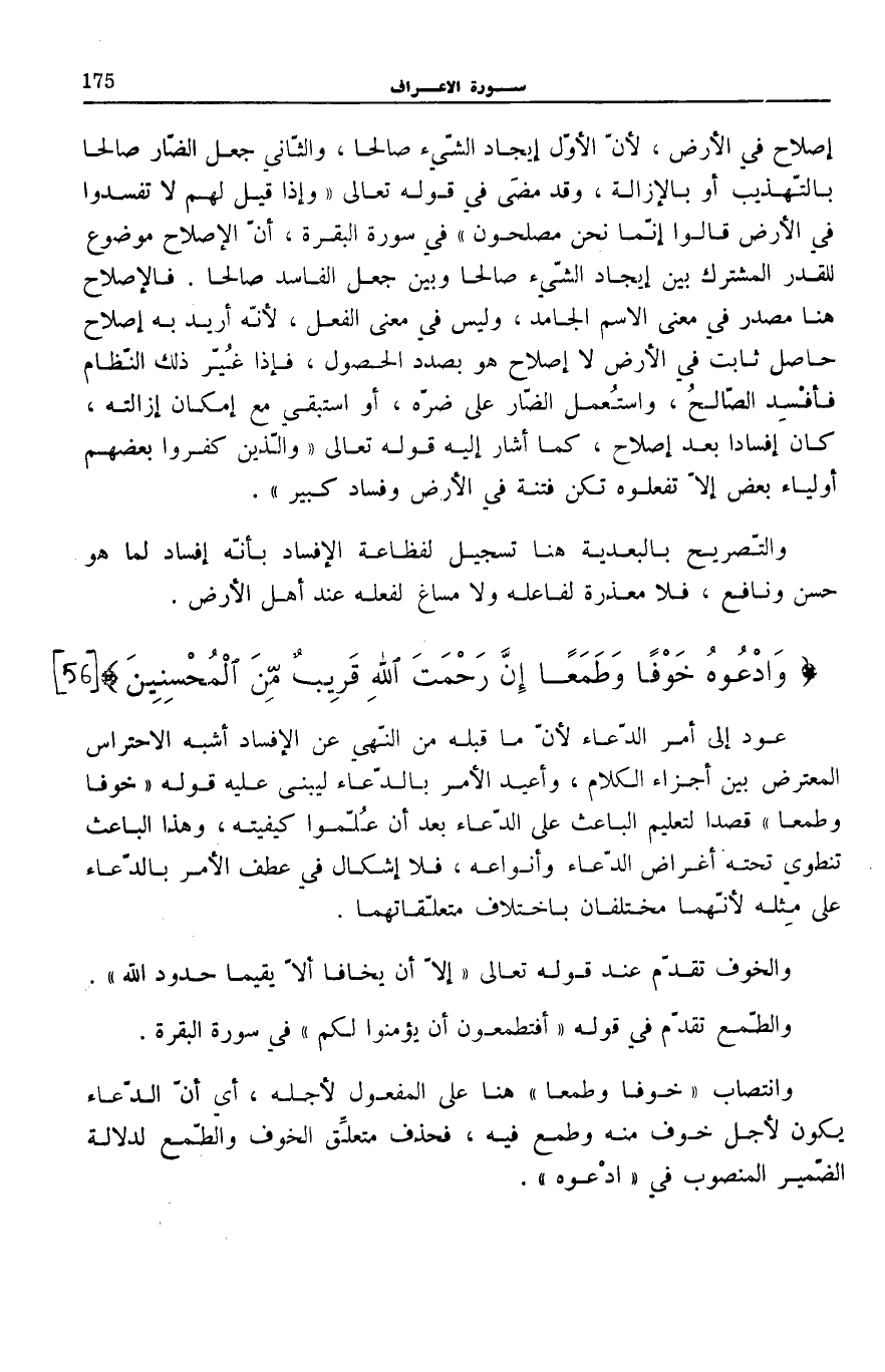 إِصْلَاحٌ فِي الْأَرْضِ، لِأَنَّ الْأَوَّلَ إِيجَادُ الشَّيْءِ صَالِحًا، وَالَثَانِي جَعْلُ الضَّارِّ صَالِحًا بِالتَّهْذِيبِ أَوْ بِالْإِزَالَةِ، وَقَدْ مَضَى فِي قَوْلِهِ تَعَالَى: وَإِذا قِيلَ لَهُمْ لَا تُفْسِدُوا فِي الْأَرْضِ قالُوا إِنَّما نَحْنُ مُصْلِحُونَ فِي سُورَةِ الْبَقَرَةِ [11] ، أَنَّ الْإِصْلَاحَ مَوْضُوعٌ لِلْقَدْرِ الْمُشْتَرَكِ بَيْنَ إِيجَادِ الشَّيْءِ صَالِحًا وَبَيْنَ جَعْلِ الْفَاسِدِ صَالِحًا. فَالْإِصْلَاحُ هُنَا مَصْدَرٌ فِي مَعْنَى الِاسْمِ الْجَامِدِ، وَلَيْسَ فِي مَعْنَى الْفِعْلِ، لِأَنَّهُ أُرِيدَ بِهِ إِصْلَاحٌ حَاصِلٌ ثَابِتٌ فِي الْأَرْضِ لَا إِصْلَاحٌ هُوَ بِصَدَدِ الْحُصُولِ، فَإِذَا غُيِّرَ ذَلِكَ النِّظَامُ فَأُفْسِدَ الصَّالِحُ، وَاسْتُعْمِلَ الضَّارُّ عَلَى ضُرِّهِ، أَوِ اسْتُبِقِيَ مَعَ إِمْكَانِ إِزَالَتِهِ، كَانَ إِفْسَادًا بَعْدَ إِصْلَاحٍ، كَمَا أَشَارَ إِلَيْهِ قَوْلُهُ تَعَالَى: وَالَّذِينَ كَفَرُوا بَعْضُهُمْ أَوْلِياءُ بَعْضٍ إِلَّا تَفْعَلُوهُ تَكُنْ فِتْنَةٌ فِي الْأَرْضِ وَفَسادٌ كَبِيرٌ [الْأَنْفَال: 73] .