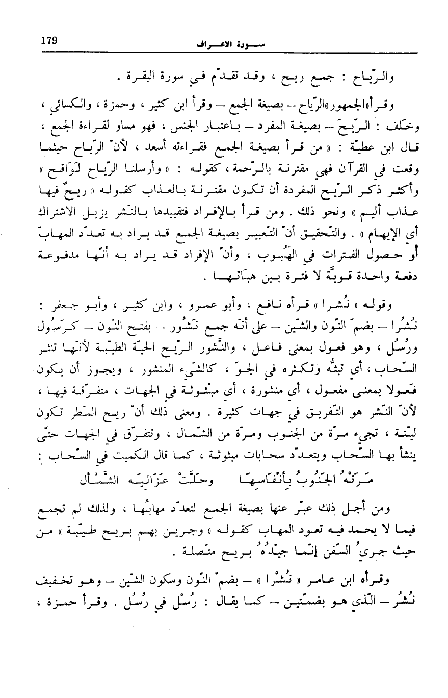 مَنْ قَرَأَ بِصِيغَةِ الْجَمْعِ فَقِرَاءَتُهُ أَسْعَدُ، لِأَنَّ الرِّيَاحَ حَيْثُمَا وَقَعَتْ فِي الْقُرْآنِ فَهِيَ مُقْتَرِنَةٌ بِالرَّحْمَةِ، كَقَوْلِهِ: وَأَرْسَلْنَا الرِّياحَ لَواقِحَ [الْحجر: 22] وَأَكْثَرُ ذِكْرِ الرِّيحِ الْمُفْرَدَةِ أَنْ تَكُونَ مُقْتَرِنَةً بِالْعَذَابِ كَقَوْلِهِ رِيحٌ فِيها عَذابٌ أَلِيمٌ [الْأَحْقَاف: 24] وَنَحْوَ ذَلِكَ. وَمَنْ قَرَأَ بِالْإِفْرَادِ فَتَقْيِيدُهَا بِالنَّشْرِ يُزِيلُ الِاشْتِرَاكَ أَيِ الْإِيهَامَ. وَالتَّحْقِيقُ أَنَّ التَّعْبِيرَ بِصِيغَةِ الْجَمْعِ قَدْ يُرَادُ بِهِ تَعَدُّدُ الْمَهَابِّ أَوْ حُصُولُ الْفَتَرَاتِ فِي الْهُبُوبِ، وَأَنَّ الْإِفْرَادَ قَدْ يُرَادُ بِهِ أَنَّهَا مَدْفُوعَةٌ دُفْعَةً