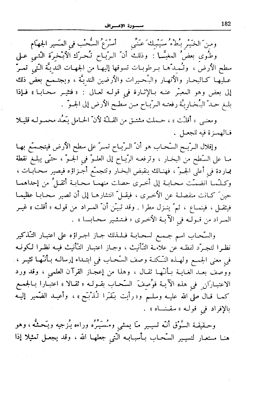 وَالسَّحَابُ اسْمُ جَمْعٍ لِسَحَابَةٍ فَلِذَلِكَ جَازَ إِجْرَاؤُهُ عَلَى اعْتِبَارِ التَّذْكِيرِ نَظَرًا لِتَجَرُّدِ لَفْظِهِ عَنْ عَلَامَةِ التَّأْنِيثِ، وَجَازَ اعْتِبَارُ التَّأْنِيثِ فِيهِ نَظَرًا لِكَوْنِهِ فِي مَعْنَى الْجَمْعِ وَلِهَذِهِ النُّكْتَةِ وُصِفَ السَّحَابُ فِي ابْتِدَاءِ إِرْسَالِهِ بِأَنَّهَا تُثِيرُ، وَوُصِفَ بَعْدَ الْغَايَةِ بِأَنَّهَا ثِقَالٌ، وَهَذَا مِنْ إِعْجَازِ الْقُرْآنِ الْعِلْمِيِّ، وَقَدْ وَرَدَ الِاعْتِبَارَانِ فِي هَذِهِ الْآيَةِ فَوَصَفَ السَّحَابَ بِقَوْلِهِ: ثِقالًا اعْتِبَارًا بِالْجَمْعِ كَمَا