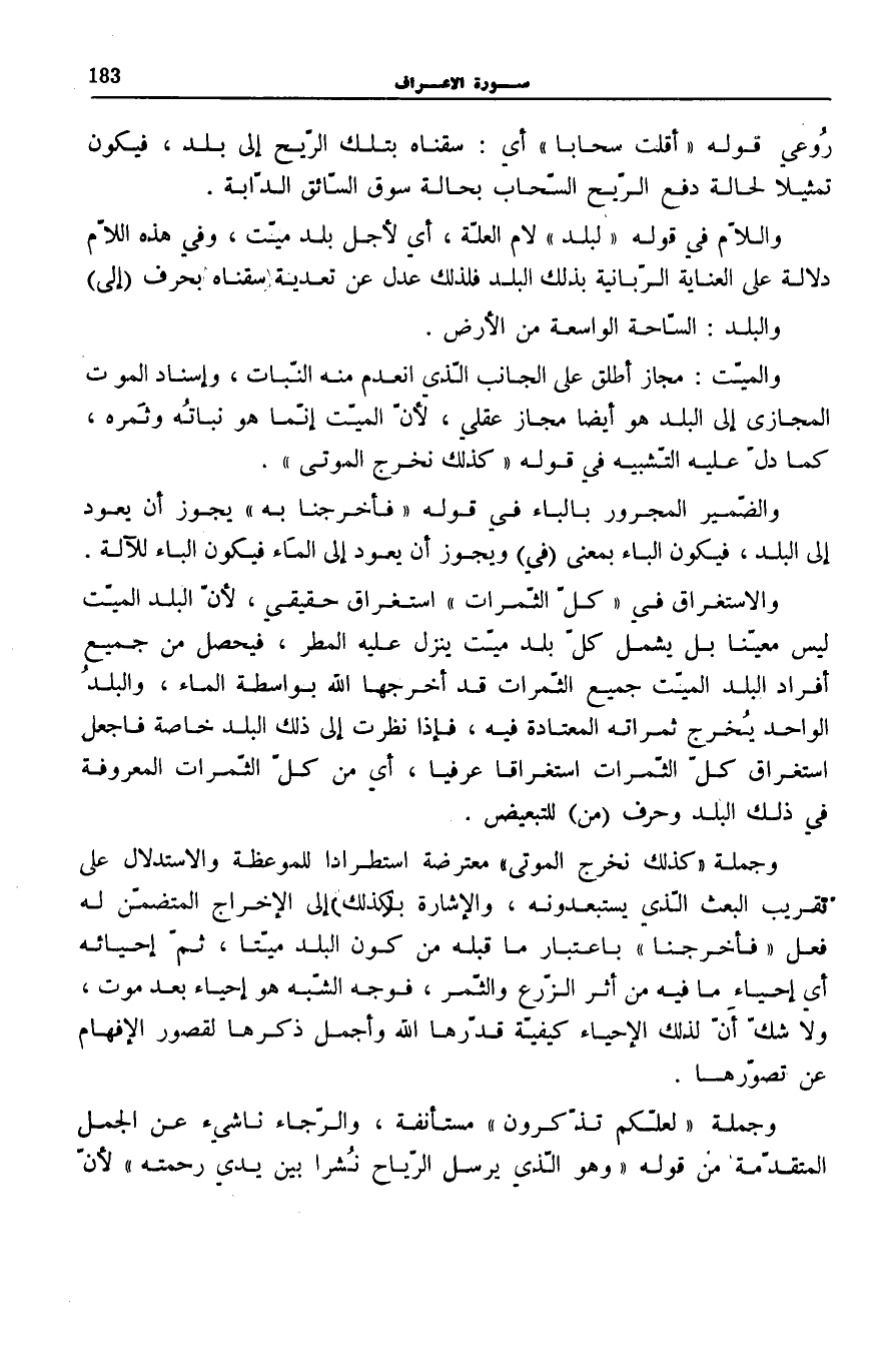 وَالِاسْتِغْرَاقُ فِي كُلِّ الثَّمَراتِ اسْتِغْرَاقٌ حَقِيقِيٌّ، لِأَنَّ الْبَلَدَ الْمَيِّتَ لَيْسَ مُعَيَّنًا بَلْ يَشْمَلُ كُلَّ بَلَدٍ مَيِّتٍ يَنْزِلُ عَلَيْهِ الْمَطَرُ، فَيَحْصُلُ مِنْ جَمِيعِ أَفْرَادِ الْبَلَدِ الْمَيِّتِ جَمِيعُ الثَّمَرَاتِ قَدْ أَخْرَجَهَا اللَّهُ بِوَاسِطَةِ الْمَاءِ، وَالْبَلَدُ الْوَاحِدُ يُخْرِجُ ثَمَرَاتِهِ الْمُعْتَادَةَ فِيهِ، فَإِذَا نَظَرْتَ إِلَى ذَلِكَ الْبَلَدِ خَاصَّةً فَاجْعَلِ اسْتِغْرَاقَ كُلِّ الثَّمَرَاتِ اسْتِغْرَاقًا عُرْفِيًّا، أَيْ مِنْ كُلِّ الثَّمَرَاتِ الْمَعْرُوفَةِ فِي ذَلِكَ الْبَلَدِ وَحَرْفُ (مِنْ) لِلتَّبْعِيضِ.
