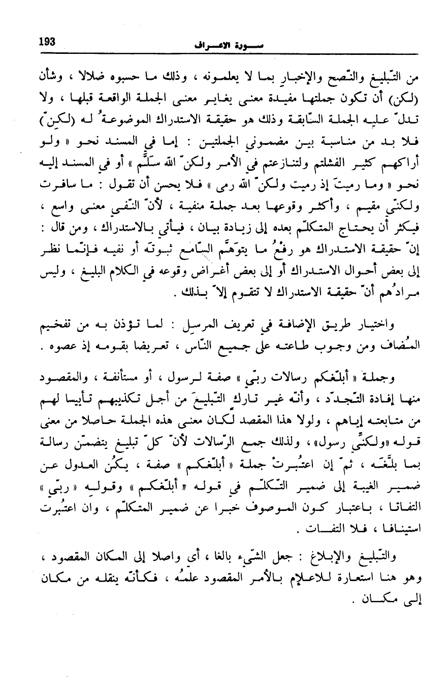 مِنَ التَّبْلِيغِ وَالنُّصْحِ وَالْإِخْبَارِ بِمَا لَا يَعْلَمُونَهُ، وَذَلِكَ مَا حَسِبُوهُ ضَلَالًا، وَشَأْنُ (لَكِنَّ) أَنْ تَكُونَ جُمْلَتُهَا مُفِيدَةً مَعْنَى يُغَايِرُ مَعْنَى الْجُمْلَةِ الْوَاقِعَةِ قَبْلَهَا، وَلَا تَدُلُّ عَلَيْهِ الْجُمْلَةُ السَّابِقَةُ وَذَلِكَ هُوَ حَقِيقَةُ الِاسْتِدْرَاكِ الْمَوْضُوعَةُ لَهُ (لَكِنَّ) فَلَا بُدَّ مِنْ مُنَاسَبَةٍ بَيْنَ مَضْمُونَيِ الْجُمْلَتَيْنِ: إِمَّا فِي الْمُسْنَدِ نَحْوَ وَلَوْ أَراكَهُمْ كَثِيراً لَفَشِلْتُمْ وَلَتَنازَعْتُمْ فِي الْأَمْرِ وَلكِنَّ اللَّهَ سَلَّمَ [الْأَنْفَال: 43] أَوْ فِي الْمُسْنَدِ إِلَيْهِ نَحْوَ وَما رَمَيْتَ إِذْ رَمَيْتَ وَلكِنَّ اللَّهَ رَمى [الْأَنْفَال: 17] فَلَا يَحْسُنُ أَنْ تَقُولَ: مَا سَافَرْتُ وَلَكِنِّي مُقِيمٌ، وَأَكْثَرُ وُقُوعِهَا بَعْدَ جُمْلَةٍ مَنْفِيَّةٍ، لِأَنَّ النَّفْيَ مَعْنًى وَاسِعٌ، فَيَكْثُرُ أَنْ