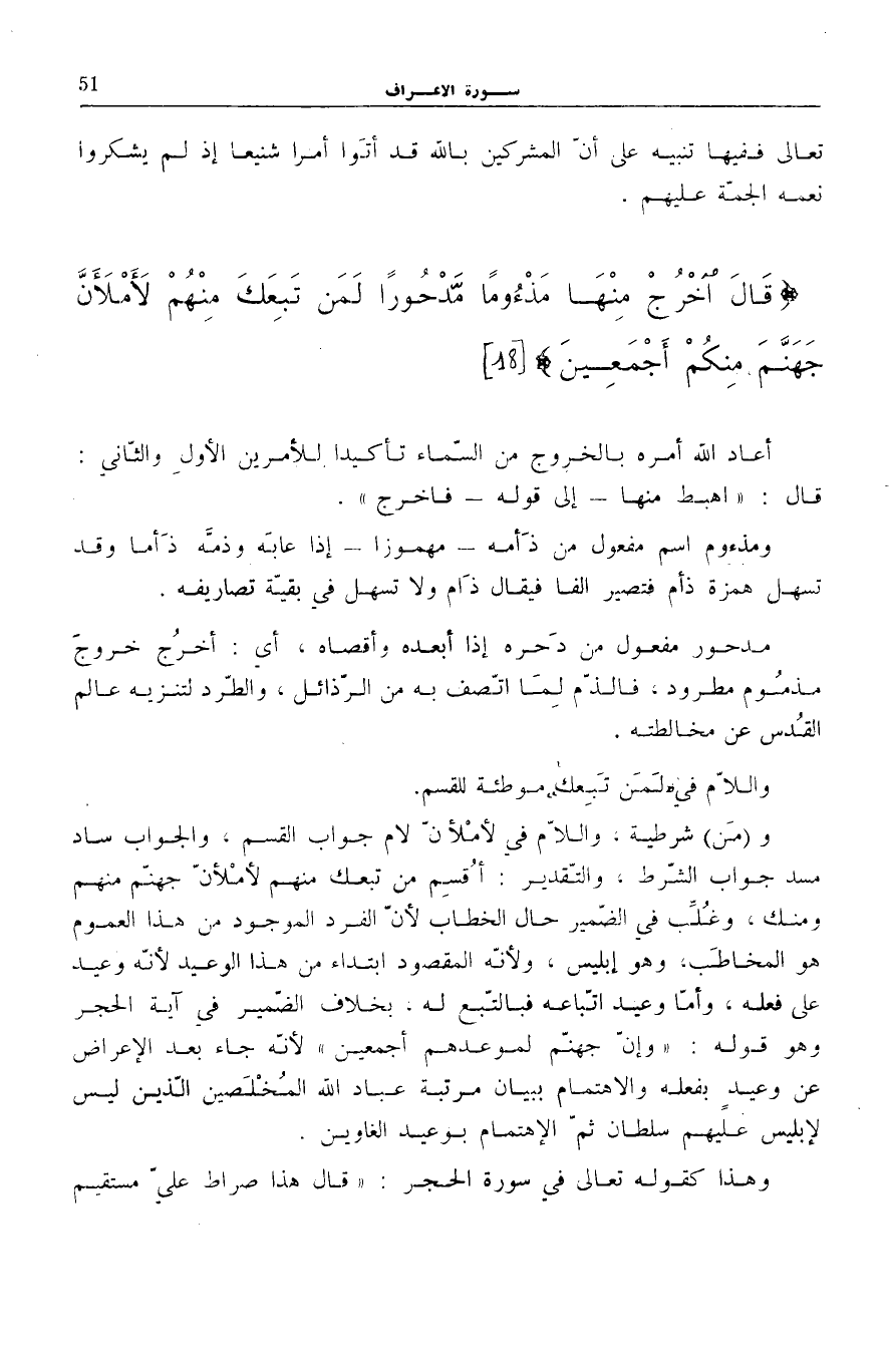 وَ (مَنْ) شَرْطِيَّةٌ، وَاللَّامُ فِي لَأَمْلَأَنَّ لَامُ جَوَابِ الْقسم، وَالْجَوَاب سَاد مَسَدَّ جَوَابِ الشَّرْطِ، وَالتَّقْدِيرُ: أُقْسِمُ مَنْ تَبِعَكَ مِنْهُمْ لَأَمْلَأَنَّ جَهَنَّمَ مِنْهُمْ وَمِنْكَ، وَغُلِّبَ فِي الضَّمِيرِ حَالُ الْخِطَابِ لِأَنَّ الْفَرْدَ الْمَوْجُودَ مِنْ هَذَا الْعُمُومِ هُوَ الْمُخَاطَبُ، وَهُوَ إِبْلِيسُ، وَلِأَنَّهُ الْمَقْصُودُ ابْتِدَاءً مِنْ هَذَا الْوَعِيدِ لِأَنَّهُ وَعِيدٌ عَلَى فِعْلِهِ، وَأَمَّا وَعِيدُ اتِّبَاعِهِ فَبِالتَّبَعِ لَهُ، بِخِلَافِ الضَّمِيرِ فِي آيَةِ الْحِجْرِ [43] وَهُوَ قَوْلُهُ: وَإِنَّ جَهَنَّمَ لَمَوْعِدُهُمْ أَجْمَعِينَ [الْحجر: 43] لِأَنَّهُ جَاءَ بَعْدَ الْإِعْرَاض عَن وعيده بِفِعْلِهِ وَالِاهْتِمَامِ بِبَيَانِ مَرْتَبَةِ عِبَادِ اللَّهِ الْمُخْلَصِينَ الَّذِينَ لَيْسَ لِإِبْلِيسَ عَلَيْهِمْ سُلْطَانٌ ثُمَّ الِاهْتِمَامُ بِوَعِيدِ الْغَاوِينَ.