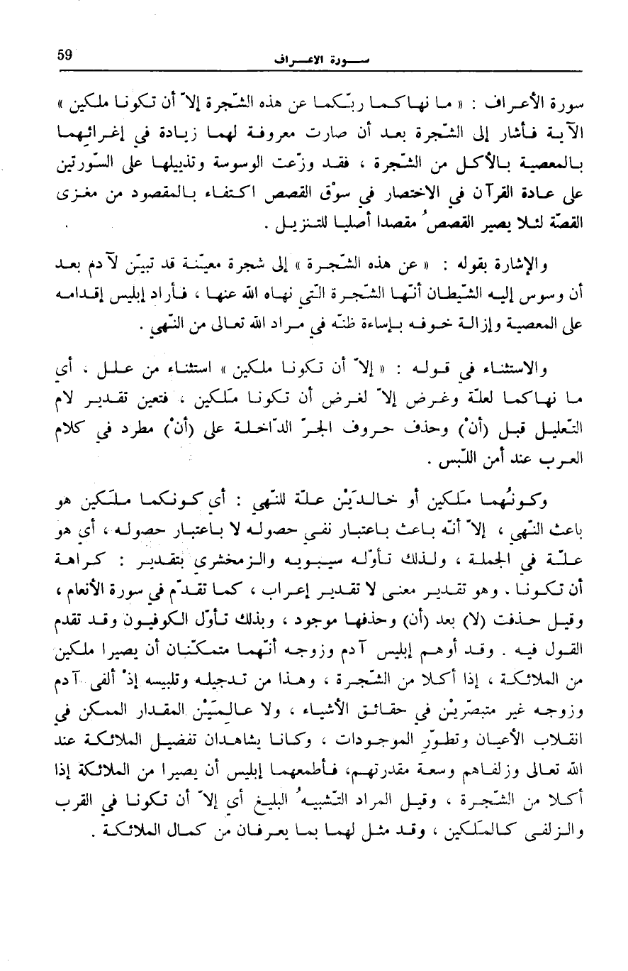 وَكَوْنُهُمَا مَلَكَيْنِ أَوْ خَالِدَيْنِ عِلَّةٌ لِلنَّهْيِ: أَيْ كَوْنُكُمَا مَلَكَيْنِ هُوَ بَاعِثُ النَّهْيِ، إِلَّا أَنَّهُ بَاعِثٌ بِاعْتِبَارِ نَفْيِ حُصُولِهِ لَا بِاعْتِبَارِ حُصُولِهِ، أَيْ هُوَ عِلَّةٌ فِي الْجُمْلَةِ، وَلِذَلِكَ تَأَوَّلَهُ سِيبَوَيْهِ وَالزَّمَخْشَرِيُّ بِتَقْدِيرِ: كَرَاهَةَ أَنْ تَكُونَا. وَهُوَ تَقْدِيرُ مَعْنًى لَا تَقْدِيرُ إِعْرَابٍ، كَمَا تَقَدَّمَ فِي سُورَةِ الْأَنْعَامِ، وَقِيلَ حُذِفَتْ (لَا) بَعْدَ (أَنْ) وَحَذْفُهَا مَوْجُودٌ، وَبِذَلِكَ تَأَوَّلَ الْكُوفِيُّونَ وَقَدْ تَقَدَّمَ الْقَوْلُ فِيهِ. وَقَدْ أَوْهَمَ إِبْلِيسُ آدَمَ وَزَوْجَهُ أَنَّهُمَا مُتَمَكِّنَانِ أَنْ يَصِيرَا مَلَكَيْنِ مِنَ الْمَلَائِكَةِ، إِذَا أَكَلَا مِنَ الشَّجَرَةِ، وَهَذَا مِنْ تَدْجِيلِهِ وَتَلْبِيسِهِ إِذْ أَلْفَى آدَمَ وَزَوْجَهُ غَيْرَ مُتَبَصِّرَيْنِ فِي حَقَائِقِ الْأَشْيَاءِ، وَلَا عَالِمَيْنِ الْمِقْدَارَ الْمُمْكِنَ فِي انْقِلَابِ الْأَعْيَانِ وَتَطَوُّرِ الْمَوْجُودَاتِ، وَكَانَا يُشَاهِدَانِ تَفْضِيلَ الْمَلَائِكَةِ عِنْدَ اللَّهِ تَعَالَى وَزُلْفَاهُمْ وَسَعَةَ مَقْدِرَتِهِمْ، فَأَطْمَعَهُمَا إِبْلِيسُ أَنْ يَصِيرَا مِنَ الْمَلَائِكَةِ إِذَا أَكَلَا مِنَ الشَّجَرَةِ، وَقِيلَ الْمُرَادُ التَّشْبِيهُ الْبَلِيغُ أَيْ إِلَّا أَنْ تَكُونَا فِي الْقُرْبِ وَالزُّلْفَى كَالْمَلَكَيْنِ، وَقَدْ مَثَّلَ لَهُمَا بِمَا يَعْرِفَانِ مِنْ كَمَالِ الْمَلَائِكَةِ.
