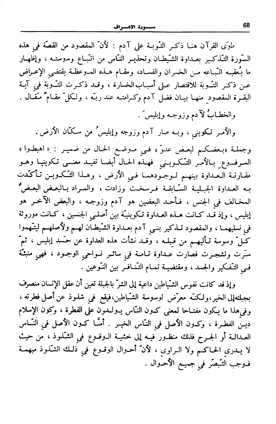 وَإِذْ قَدْ كَانَتْ نُفُوسُ الشَّيَاطِينِ دَاعِيَةً إِلَى الشَّرِّ بِالْجِبِلَّةِ تَعَيَّنَ أَنَّ عَقْلَ الْإِنْسَانِ مُنْصَرِفٌ بِجِبِلَّتِهِ إِلَى الْخَيْرِ، وَلَكِنَّهُ مُعْرِضٌ لِوَسْوَسَةِ الشَّيَاطِينِ فَيَقَعُ فِي شُذُوذٍ عَنْ أَصْلِ فِطْرَتِهِ، وَفِي هَذَا مَا يَكُونُ مِفْتَاحًا لِمَعْنَى كَوْنِ النَّاسِ يُولَدُونَ عَلَى الْفِطْرَةِ، وَكَوْنِ الْإِسْلَامِ دِينَ الْفِطْرَةِ، وَكَوْنِ الْأَصْلِ فِي النَّاسِ الْخَيْرَ. أَمَّا كَوْنُ الْأَصْلِ فِي النَّاسِ الْعَدَالَةَ أَوِ الْجَرْحِ فَذَلِكَ مَنْظُورٌ فِيهِ إِلَى خَشْيَةِ الْوُقُوعِ فِي الشُّذُوذِ، مِنْ حَيْثُ لَا يَدْرِي الْحَاكِمُ وَلَا الرَّاوِي، لِأَنَّ أَحْوَالَ الْوُقُوعِ فِي ذَلِكَ الشُّذُوذِ مُبْهَمَةٌ فَوَجَبَ التَّبَصُّرُ فِي جَمِيعِ الْأَحْوَالِ.