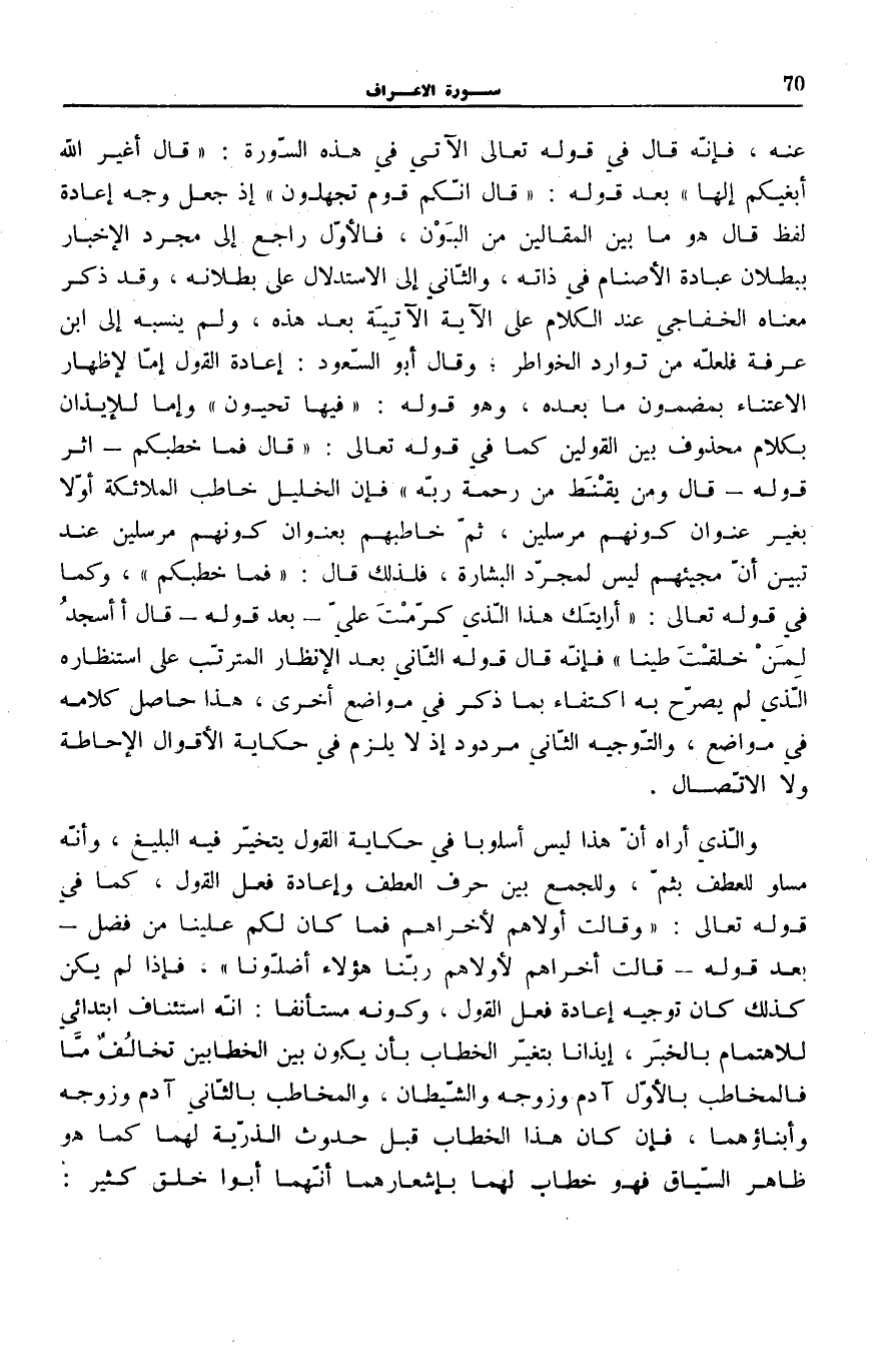 عَنْهُ، فَإِنَّهُ قَالَ فِي قَوْلِهِ تَعَالَى الْآتِي فِي هَذِهِ السُّورَةِ [140] : قالَ أَغَيْرَ اللَّهِ أَبْغِيكُمْ إِلهاً بَعْدَ قَوْلِهِ: قالَ إِنَّكُمْ قَوْمٌ تَجْهَلُونَ [الْأَعْرَاف: 138] إِذْ جَعَلَ وَجْهَ إِعَادَةِ لَفْظِ قَالَ هُوَ مَا بَيْنَ الْمَقَالَيْنِ مِنَ الْبَوْنِ، فَالْأَوَّلُ رَاجِعٌ إِلَى مُجَرَّدِ الْإِخْبَارِ بِبُطْلَانِ عِبَادَةِ الْأَصْنَامِ فِي ذَاتِهِ، وَالثَّانِي إِلَى الِاسْتِدْلَالِ عَلَى بُطْلَانِهِ، وَقَدْ ذَكَرَ مَعْنَاهُ الْخَفَاجِيُّ عِنْدَ الْكَلَامِ عَلَى الْآيَةِ الْآتِيَةِ بَعْدَ هَذِهِ، وَلَمْ يَنْسُبْهُ إِلَى ابْنِ عَرَفَةَ فَلَعَلَّهُ مِنْ تَوَارُدِ الْخَوَاطِرِ وَقَالَ أَبُو السُّعُودِ: إِعَادَةُ الْقَوْلِ إِمَّا لِإِظْهَارِ الِاعْتِنَاءِ بِمَضْمُونِ مَا بَعْدَهُ، وَهُوَ قَوْلُهُ: فِيها تَحْيَوْنَ [الْأَعْرَاف: 25] وَإِمَّا لِلْإِيذَانِ بِكَلَامٍ مَحْذُوفٍ بَيْنَ الْقَوْلَيْنِ كَمَا فِي قَوْلِهِ تَعَالَى: قالَ فَما خَطْبُكُمْ [الْحجر: 57]- إِثْرَ قَوْلِهِ- قالَ وَمَنْ يَقْنَطُ مِنْ رَحْمَةِ رَبِّهِ [الْحجر: 56] فَإِنَّ الْخَلِيلَ خَاطَبَ الْمَلَائِكَةَ أَوَّلًا بِغَيْرِ عُنْوَانِ كَوْنِهِمْ مُرْسَلِينَ، ثُمَّ خَاطَبَهُمْ بِعُنْوَانِ كَوْنِهِمْ مُرْسَلِينَ عِنْدَ تَبَيُّنِ أَنَّ مَجِيئَهُمْ لَيْسَ لِمُجَرَّدِ الْبِشَارَةِ، فَلِذَلِكَ قَالَ: فَما خَطْبُكُمْ، وَكَمَا فِي قَوْلِهِ تَعَالَى: أَرَأَيْتَكَ هذَا الَّذِي كَرَّمْتَ عَلَيَّ [الْإِسْرَاء: 62]- بَعْدَ قَوْلِهِ- قالَ أَأَسْجُدُ لِمَنْ خَلَقْتَ طِيناً [الْإِسْرَاء: 61] فَإِنَّهُ قَالَ قَوْلَهُ الثَّانِيَ بَعْدَ الْإِنْظَارِ الْمُتَرَتَّبِ عَلَى اسْتِنْظَارِهِ الَّذِي لَمْ يُصَرِّحْ بِهِ اكْتِفَاءً بِمَا ذَكَرَ فِي