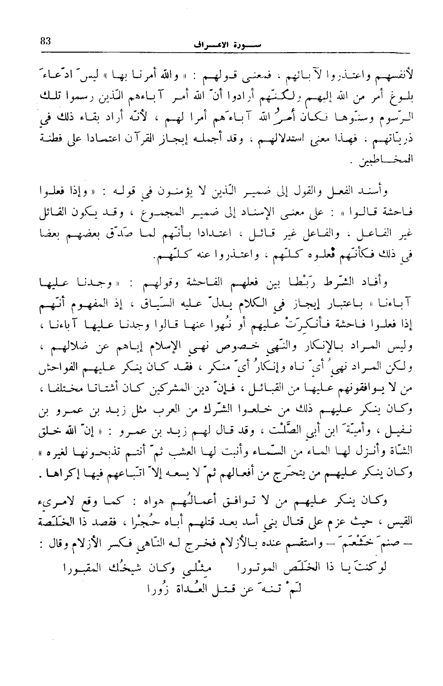 لِأَنْفُسِهِمْ وَاعْتَذَرُوا لِآبَائِهِمْ، فَمَعْنَى قَوْلِهِمْ: وَاللَّهُ أَمَرَنا بِها لَيْسَ ادِّعَاءُ بُلُوغِ أَمْرٍ مِنَ اللَّهِ إِلَيْهِمْ وَلَكِنَّهُمْ أَرَادُوا أَنَّ اللَّهَ أَمَرَ آبَاءَهُمُ الَّذِينَ رَسَمُوا تِلْكَ الرُّسُومَ وَسَنُّوهَا فَكَانَ أَمْرُ اللَّهِ آبَاءَهُمْ أَمْرًا لَهُمْ، لِأَنَّهُ أَرَادَ بَقَاءَ ذَلِكَ فِي ذُرِّيَّاتِهِمْ، فَهَذَا مَعْنَى اسْتِدْلَالِهِمْ، وَقَدْ أَجْمَلَهُ إِيجَازُ الْقُرْآنِ اعْتِمَادًا عَلَى فِطْنَةِ الْمُخَاطَبِينَ.