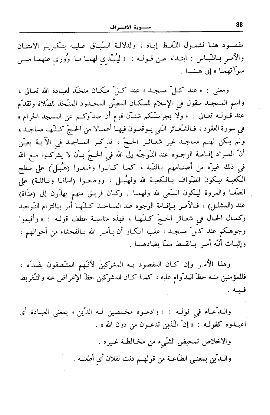 وَمَعْنَى: عِنْدَ كُلِّ مَسْجِدٍ عِنْدَ كُلِّ مَكَانٍ مُتَّخَذٍ لِعِبَادَةِ اللَّهِ تَعَالَى، وَاسْمُ الْمَسْجِدِ مَنْقُولٌ فِي الْإِسْلَامِ لِلْمَكَانِ الْمُعَيَّنِ الْمَحْدُودِ الْمُتَّخَذِ لِلصَّلَاةِ وَتَقَدَّمَ عِنْدَ قَوْلِهِ تَعَالَى: وَلا يَجْرِمَنَّكُمْ شَنَآنُ قَوْمٍ أَنْ صَدُّوكُمْ عَنِ الْمَسْجِدِ الْحَرامِ فِي سُورَةِ الْعُقُودِ [2] ، فَالشَّعَائِرُ الَّتِي يُوقِعُونَ فِيهَا أَعْمَالًا مِنَ الْحَجِّ كُلُّهَا مَسَاجِدُ، وَلَمْ يَكُنْ لَهُمْ مَسَاجِدُ غَيْرَ شَعَائِرِ الْحَجِّ، فَذِكْرُ الْمَسَاجِدِ فِي الْآيَةِ يُعَيِّنُ أَنَّ الْمُرَادَ إِقَامَةُ الْوُجُوهِ عِنْدَ التَّوَجُّهِ إِلَى اللَّهِ فِي الْحَجِّ بِأَنْ لَا يُشْرِكُوا مَعَ اللَّهِ فِي ذَلِكَ غَيْرَهُ مِنْ أَصْنَامِهِمْ بِالنِّيَّةِ، كَمَا كَانُوا وَضَعُوا (هُبَلَ) عَلَى سَطْحِ الْكَعْبَةِ لِيَكُونَ الطَّوَافُ بِالْكَعْبَةِ لِلَّهِ وَلِهُبَلَ، وَوَضَعُوا (إِسَافًا وَنَائِلَةَ) عَلَى الصَّفَا وَالْمَرْوَةِ لِيَكُونَ السَّعْيُ لِلَّهِ وَلَهُمَا. وَكَانَ فَرِيقٌ مِنْهُمْ يُهِلُّونَ إِلَى (مَنَاةَ) عِنْدَ (الْمُشَلَّلِ) ، فَالْأَمْرُ بِإِقَامَةِ الْوُجُوهِ عِنْدَ الْمَسَاجِدِ كُلِّهَا أَمْرٌ بِالْتِزَامِ التَّوْحِيدِ وَكَمَالِ الْحَالِ فِي شَعَائِرِ الْحَجِّ كُلِّهَا، فَهَذِهِ مُنَاسَبَةُ عَطْفِ قَوْلِهِ: وَأَقِيمُوا وُجُوهَكُمْ عِنْدَ كُلِّ مَسْجِدٍ عَقِبَ إِنْكَارِ أَنْ يَأْمُرَ اللَّهُ بِالْفَحْشَاءِ مِنْ أَحْوَالِهِمْ، وَإِثْبَاتِ أَنَّهُ أَمَرَ بِالْقِسْطِ مِمَّا يُضَادُّهَا. وَهَذَا الْأَمْرُ وَإِنْ كَانَ الْمَقْصُودُ بِهِ الْمُشْرِكِينَ لِأَنَّهُمُ الْمُتَّصِفُونَ بِضِدِّهِ، فَلِلْمُؤْمِنِينَ مِنْهُ حَظُّ الدَّوَامِ عَلَيْهِ، كَمَا كَانَ لِلْمُشْرِكِينَ حَظُّ الْإِعْرَاضِ عَنْهُ وَالتَّفْرِيطِ فِيهِ.