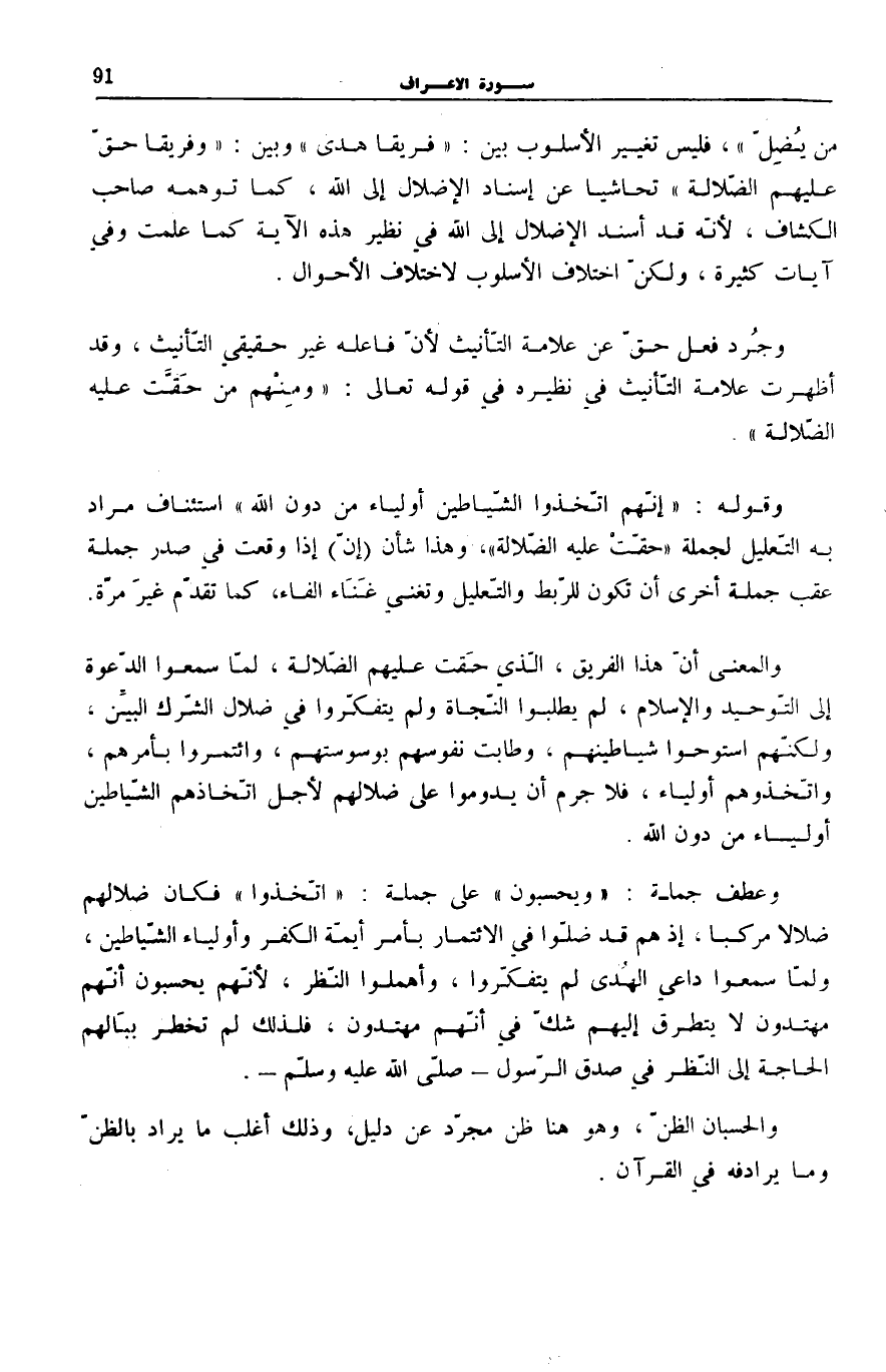 فَلَيْسَ تَغْيِيرُ الْأُسْلُوبِ بَيْنَ: فَرِيقاً هَدى وَبَيْنَ وَفَرِيقاً حَقَّ عَلَيْهِمُ الضَّلالَةُ تَحَاشِيًا عَنْ إِسْنَادِ الْإِضْلَالِ إِلَى اللَّهِ، كَمَا تَوَهَّمَهُ صَاحِبُ «الْكَشَّافِ» ، لِأَنَّهُ قَدْ أَسْنَدَ الْإِضْلَالَ إِلَى اللَّهِ فِي نَظِيرِ هَذِهِ الْآيَةِ كَمَا عُلِمَتْ وَفِي آيَاتٍ كَثِيرَةٍ، وَلَكِنَّ اخْتِلَافَ الْأُسْلُوبِ لِاخْتِلَافِ الْأَحْوَالِ.