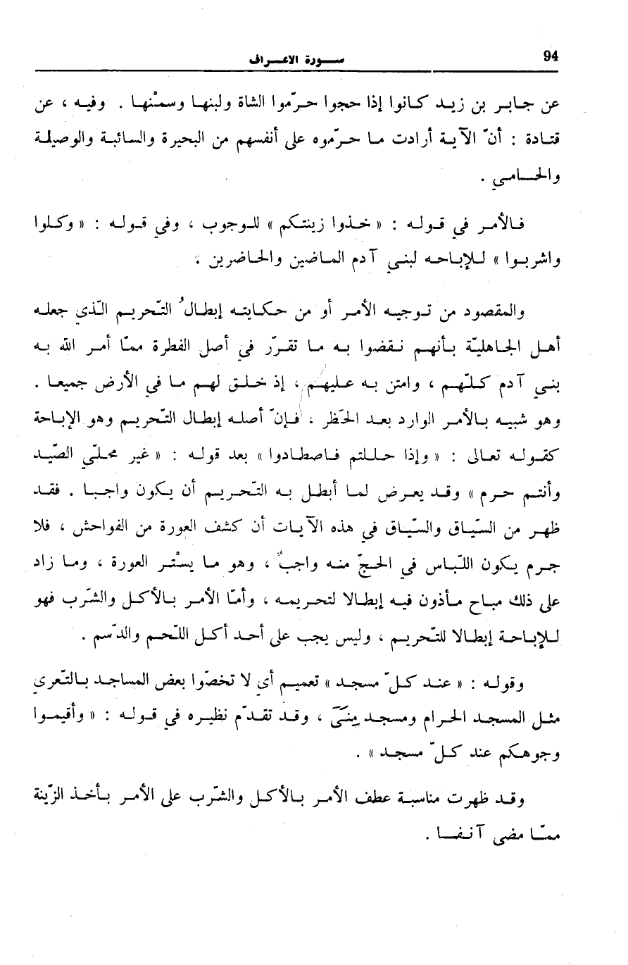 وَالْمَقْصُودُ مِنْ تَوْجِيهِ الْأَمْرِ أَوْ مِنْ حِكَايَتِهِ إِبْطَالُ التَّحْرِيمِ الَّذِي جَعَلَهُ أَهْلُ الْجَاهِلِيَّةِ بِأَنَّهُمْ نَقَضُوا بِهِ مَا تَقَرَّرَ فِي أَصْلِ الْفِطْرَةِ مِمَّا أَمَرَ اللَّهُ بِهِ بَنِي آدَمَ كُلَّهُمْ، وَامْتَنَّ بِهِ عَلَيْهِمْ، إِذْ خَلَقَ لَهُمْ مَا فِي الْأَرْضِ جَمِيعًا. وَهُوَ شَبِيهٌ بِالْأَمْرِ الْوَارِدِ بَعْدَ الْحَظْرِ. فَإِنَّ أَصْلَهُ إِبْطَالُ التَّحْرِيمِ وَهُوَ الْإِبَاحَةُ كَقَوْلِهِ تَعَالَى: وَإِذا حَلَلْتُمْ فَاصْطادُوا [الْمَائِدَة: 2] بَعْدَ قَوْلِهِ: غَيْرَ مُحِلِّي الصَّيْدِ وَأَنْتُمْ حُرُمٌ [الْمَائِدَة: 1] وَقَدْ يَعْرِضُ لِمَا أَبْطَلَ بِهِ التَّحْرِيمَ أَنْ يَكُونَ وَاجِبًا. فَقَدْ ظَهَرَ من السّياق والسّباق فِي هَذِهِ الْآيَاتِ أَنَّ كَشْفَ الْعَوْرَةِ مِنَ الْفَوَاحِشِ، فَلَا جَرَمَ يَكُونُ