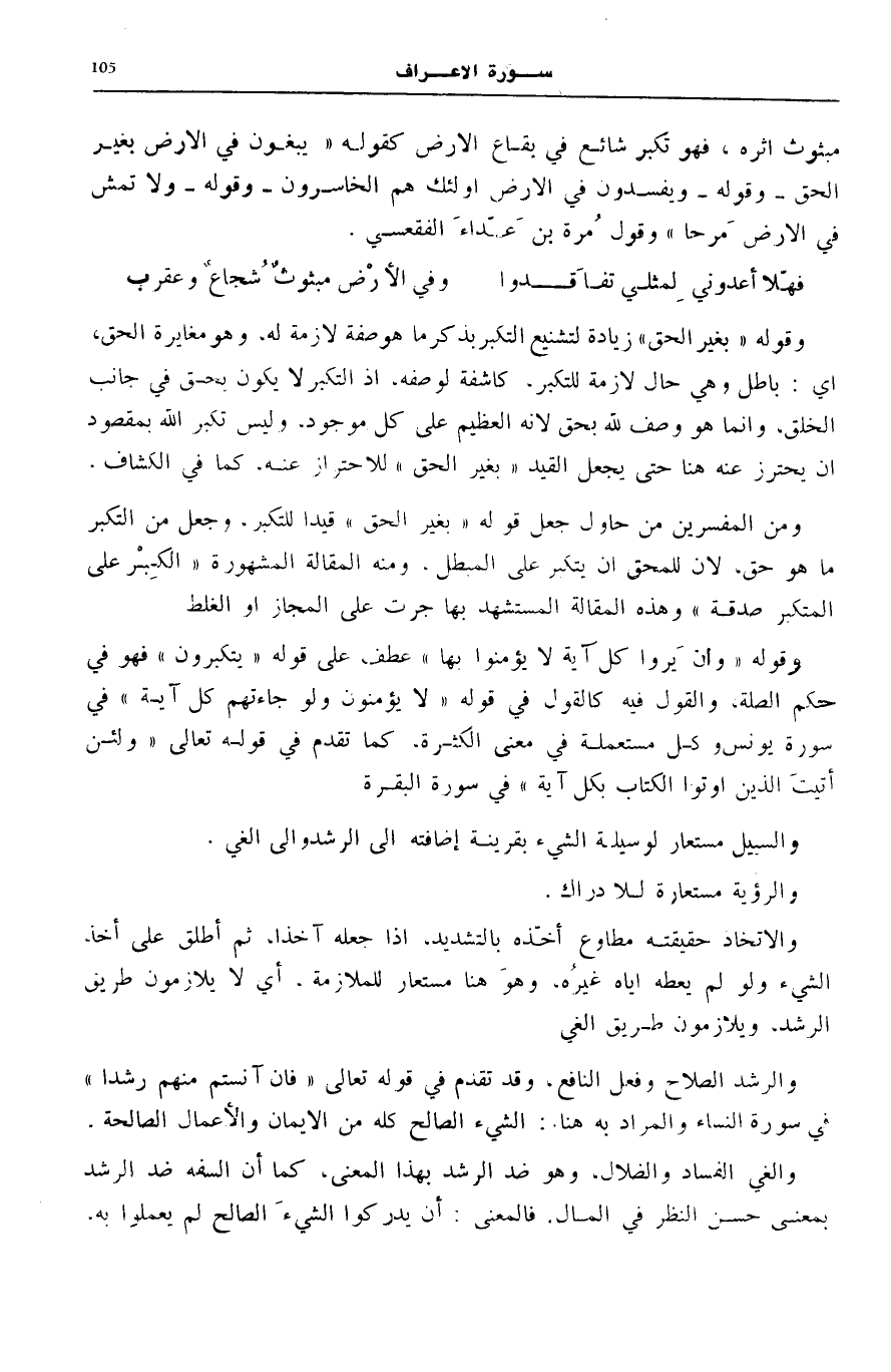 وَقَوْلُهُ: بِغَيْرِ الْحَقِّ زِيَادَةٌ لِتَشْنِيعِ التَّكَبُّرِ بِذِكْرِ مَا هُوَ صِفَةٌ لَازِمَةٌ لَهُ، وَهُوَ مُغَايَرَةُ الْحَقِّ، أَيْ: بَاطِلٌ وَهِيَ حَالٌ لَازِمَةٌ لِلتَّكَبُّرِ، كَاشِفَةٌ لِوَصْفِهِ، إِذِ التَّكَبُّرُ لَا يَكُونُ بِحَقٍّ فِي جَانِبِ الْخَلْقِ، وَإِنَّمَا هُوَ وَصْفٌ لِلَّهِ بِحَقٍّ لِأَنَّهُ الْعَظِيمُ عَلَى كُلِّ مَوْجُودٍ، وَلَيْسَ تَكَبُّرُ اللَّهِ بِمَقْصُودٍ أَنْ يُحْتَرَزَ عَنْهُ هُنَا حَتَّى يُجْعَلَ الْقَيْدُ بِغَيْرِ الْحَقِّ لِلِاحْتِرَازِ عَنْهُ، كَمَا فِي