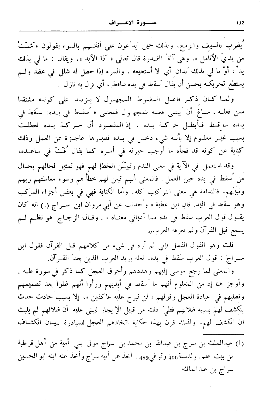 قُلْتُ وَهُوَ الْقَوْلُ الْفَصْلُ، فَإِنِّي لَمْ أَرَهُ فِي شَيْءٍ مِنْ كَلَامِهِمْ قَبْلَ الْقُرْآنِ، فَقَوْلُ ابْنِ سِرَاجٍ: قَوْلُ الْعَرَبِ سُقِطَ فِي يَدِهِ، لَعَلَّهُ يُرِيدُ الْعَرَبَ الَّذِينَ بَعْدَ الْقُرْآنِ.