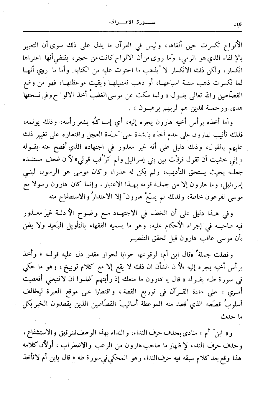 وَفُصِلَتْ جُمْلَةُ: قالَ ابْنَ أُمَّ لوقوعها جوابها لِحِوَارٍ مُقَدَّرٍ دَلَّ عَلَيْهِ قَوْلُهُ وَأَخَذَ بِرَأْسِ أَخِيهِ يَجُرُّهُ إِلَيْهِ لِأَنَّ الشَّأْنَ أَنَّ ذَلِكَ لَا يَقَعُ إِلَّا مَعَ كَلَامِ تَوْبِيخٍ، وَهُوَ مَا حُكِيَ فِي سُورَةِ طه [92، 93] بِقَوْلِهِ: قالَ يَا هارُونُ مَا مَنَعَكَ إِذْ رَأَيْتَهُمْ ضَلُّوا أَلَّا تَتَّبِعَنِ أَفَعَصَيْتَ أَمْرِي عَلَى عَادَةِ الْقُرْآنِ فِي تَوْزِيعِ الْقِصَّةِ، وَاقْتِصَارًا عَلَى مَوْقِعِ الْعِبْرَةِ لِيُخَالِفَ أُسْلُوبُ قَصَصِهِ الَّذِي قُصِدَ مِنْهُ الْمَوْعِظَةُ أَسَالِيبَ الْقَصَّاصِينَ الَّذِينَ يَقْصِدُونَ الْخَبَرَ بِكُلِّ مَا حَدَثَ.