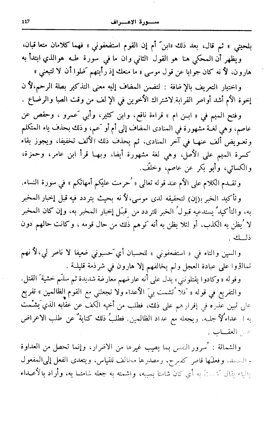 ثُمَّ قَالَ، بَعْدَ ذَلِكَ ابْنَ أُمَّ إِنَّ الْقَوْمَ اسْتَضْعَفُونِي فَهُمَا كَلَامَانِ مُتَعَاقِبَانِ، وَيَظْهَرُ أَنَّ الْمَحْكِيَّ هُنَا هُوَ الْقَوْلُ الثَّانِي، وَأَنَّ مَا فِي سُورَةِ طَهَ هُوَ الَّذِي ابْتَدَأَ بِهِ هَارُونُ، لِأَنَّهُ كَانَ جَوَابًا عَنْ قَوْلِ مُوسَى: مَا مَنَعَكَ إِذْ رَأَيْتَهُمْ ضَلُّوا أَلَّا تَتَّبِعَنِ [طه: 92، 93] .