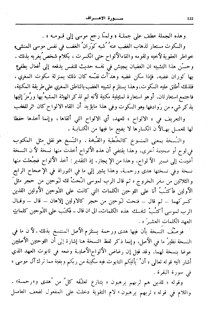 وَالنُّسْخَةُ بِمَعْنَى الْمَنْسُوخِ، كَالْخُطْبَةِ وَالْقُبْضَةِ، وَالنَّسْخُ هُوَ نَقْلُ مِثْلِ الْمَكْتُوبِ فِي لَوْحٍ أَوْ صَحِيفَةٍ أُخْرَى، وَهَذَا يَقْتَضِي أَنَّ هَذِهِ الْأَلْوَاحَ أُخِذَتْ مِنْهَا نُسْخَةٌ، لِأَنَّ النُّسْخَةَ أُضِيفَتْ إِلَى ضَمِيرِ الْأَلْوَاحِ، وَهَذَا مِنَ الْإِيجَازِ، إِذِ التَّقْدِيرُ: أَخَذَ الْأَلْوَاحَ فَجُعِلَتْ مِنْهَا نُسْخَةٌ وَفِي نُسْخَتِهَا هُدًى وَرَحْمَةٌ، وَهَذَا يُشِيرُ إِلَى مَا فِي التَّوْرَاةِ فِي الْإِصْحَاحِ الرَّابِعِ وَالثَلَاثِينَ مِنْ سِفْرِ الْخُرُوجِ «ثُمَّ قَالَ الرَّبُّ لِمُوسَى انْحِتْ لَكَ لَوْحَيْنِ مِنْ حَجَرٍ مِثْلَ الْأَوَّلَيْنِ فَأَكْتُبُ أَنَا عَلَى اللَّوْحَيْنِ الْكَلِمَاتِ الَّتِي كَانَتْ عَلَى اللَّوْحَيْنِ الْأَوَّلَيْنِ اللَّذَيْنِ كَسَرْتَهُمَا» - ثُمَّ قَالَ- «فَنَحَتَ لَوْحَيْنِ مِنْ حجر كالأولين الإهان» - قَالَ- «وَقَالَ الرَّبُّ لِمُوسَى اكْتُبْ لِنَفْسِكَ هَذِهِ الْكَلِمَاتِ» - إِلَى أَنْ قَالَ- «فَكَتَبَ عَلَى اللَّوْحَيْنِ كَلِمَاتِ الْعَهْدِ الْكَلِمَاتِ الْعَشْرَ» .