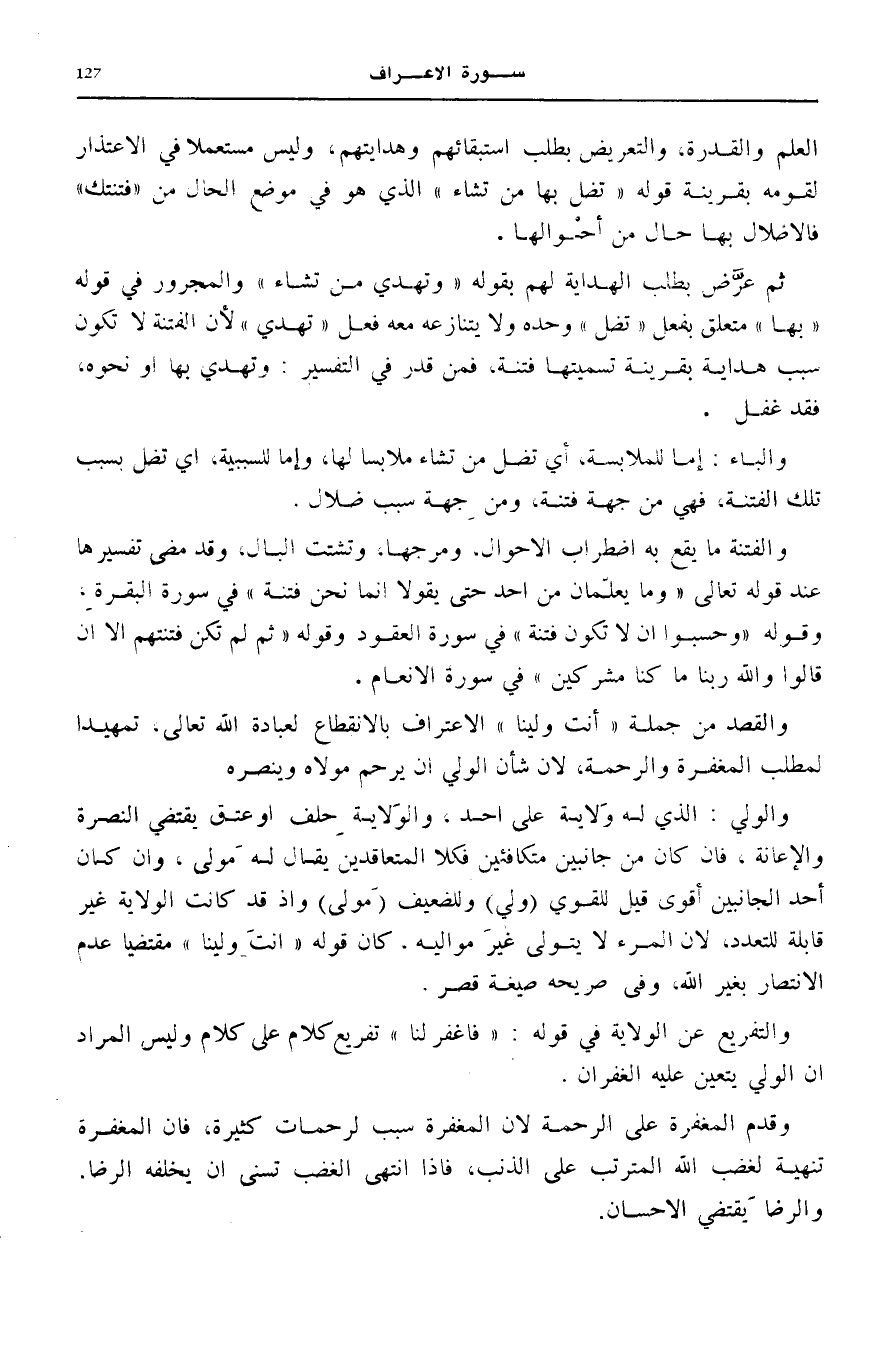 الْعِلْمِ وَالْقُدْرَةِ، وَالتَّعْرِيضِ بِطَلَبِ اسْتِبْقَائِهِمْ وَهِدَايَتِهِمْ، وَلَيْسَ مُسْتَعْمَلًا فِي الِاعْتِذَارِ لِقَوْمِهِ بِقَرِينَةِ قَوْلِهِ: تُضِلُّ بِها مَنْ تَشاءُ الَّذِي هُوَ فِي مَوْضِعِ الْحَالِ مِنْ فِتْنَتُكَ فَالْإِضْلَالُ بِهَا حَالٌ مِنْ أَحْوَالِهَا.