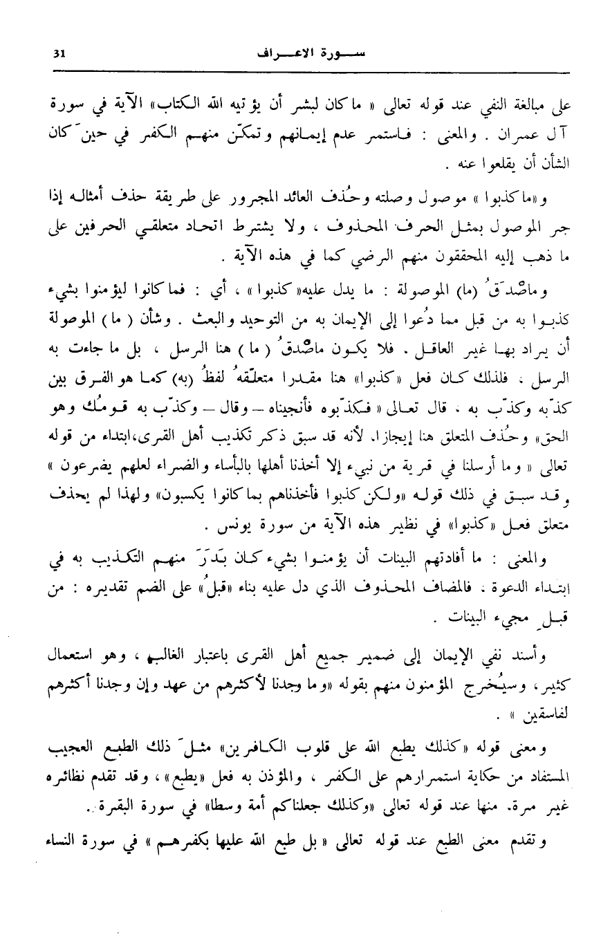عَلَى مُبَالَغَةِ النَّفْيِ عِنْدَ قَوْلِهِ تَعَالَى: مَا كانَ لِبَشَرٍ أَنْ يُؤْتِيَهُ اللَّهُ الْكِتابَ الْآيَةَ فِي سُورَةِ آلِ عِمْرَانَ [79] . وَالْمَعْنَى: فَاسْتَمَرَّ عَدَمُ إِيمَانِهِمْ وَتَمَكَّنَ مِنْهُمُ الْكُفْرُ فِي حِينِ كَانَ الشَّأْنُ أَنْ يقلعوا عَنهُ.