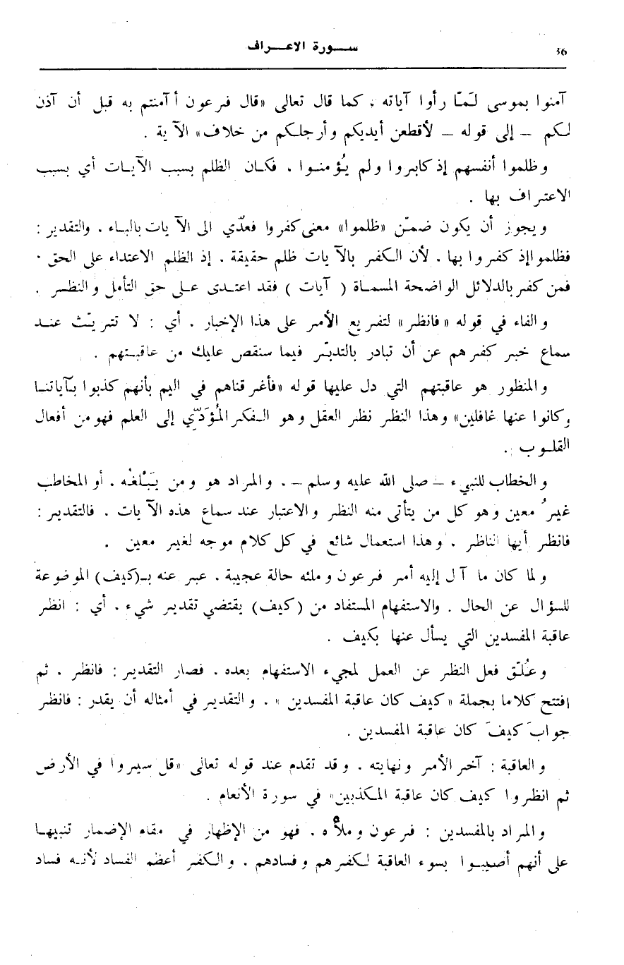 وَعُلِّقَ فِعْلُ النَّظَرِ عَنِ الْعَمَلِ لِمَجِيءِ الِاسْتِفْهَامِ بَعْدَهُ، فَصَارَ التَّقْدِيرُ: فَانْظُرْ، ثُمَّ افْتَتَحَ كَلَامًا بِجُمْلَةِ كَيْفَ كانَ عاقِبَةُ الْمُفْسِدِينَ، وَالتَّقْدِيرُ فِي أَمْثَالِهِ أَنْ يُقَدَّرَ: فَانْظُرْ جَوَابَ كَيْفَ كَانَ عَاقِبَةُ الْمُفْسِدِينَ.