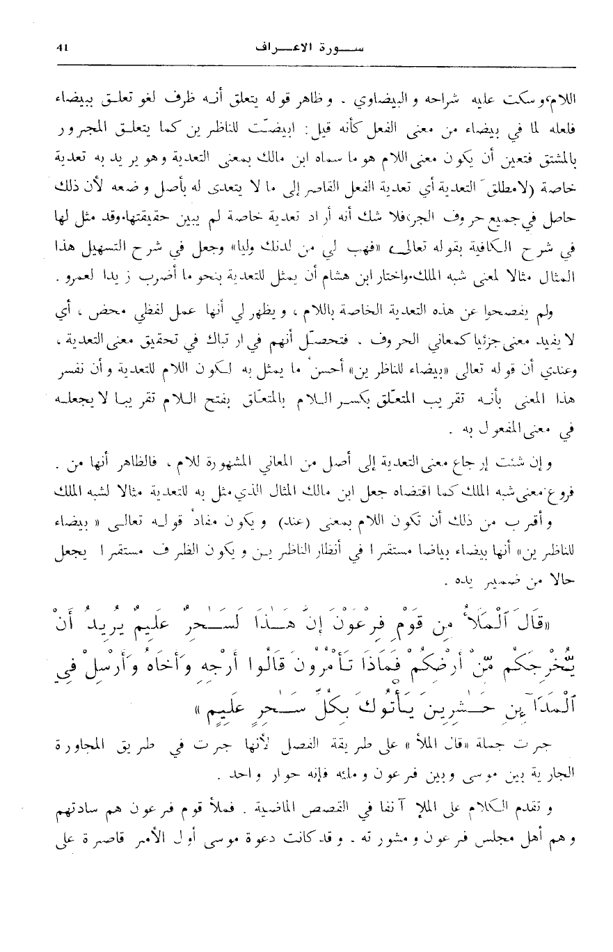 وَلَمْ يُفْصِحُوا عَنْ هَذِهِ التَّعْدِيَةِ الْخَاصَّةِ بِاللَّامِ، وَيَظْهَرُ لِي أَنَّهَا عَمَلٌ لَفْظِيٌّ مَحْضٌ، أَيْ لَا يُفِيدُ مَعْنًى جُزْئِيًّا كَمَعَانِي الْحُرُوفِ، فَتَحَصَّلَ أَنَّهُمْ فِي ارْتِبَاكٍ فِي تَحْقِيقِ مَعْنَى التَّعْدِيَةِ، وَعِنْدِي أَنَّ قَوْلَهُ تَعَالَى: بَيْضاءُ لِلنَّاظِرِينَ أَحْسُنُ مَا يُمَثَّلُ بِهِ لِكَوْنِ اللَّامِ لِلتَّعْدِيَةِ وَأَنْ نُفَسِّرَ هَذَا الْمَعْنَى بِأَنَّهُ تَقْرِيبُ الْمُتَعَلِّقِ بِكَسْر اللَّام لمتعلّق بِفَتْحِ اللَّامِ تَقْرِيبًا لَا يَجْعَلُهُ فِي مَعْنَى الْمَفْعُولِ بِهِ.