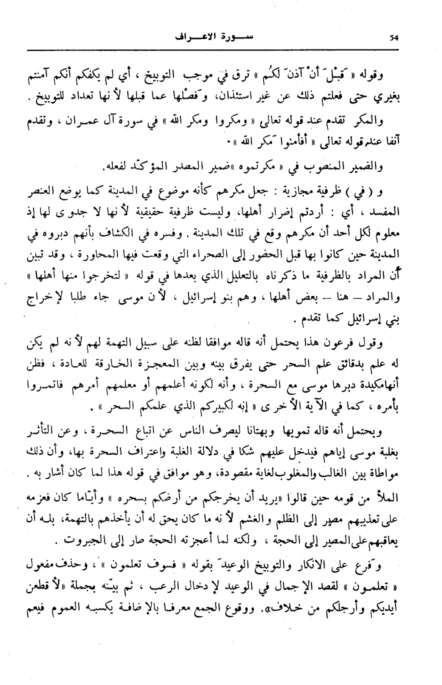 أَحَدٍ أَنَّ مَكْرَهُمْ وَقَعَ فِي تِلْكَ الْمَدِينَةِ، وَفَسَّرَهُ فِي «الْكَشَّافِ» بِأَنَّهُمْ دَبَّرُوهُ فِي الْمَدِينَةِ حِينَ كَانُوا بِهَا قَبْلَ الْحُضُورِ إِلَى الصَّحْرَاءِ الَّتِي وَقَعَتْ فِيهَا الْمُحَاوَرَةُ، وَقَدْ تَبَيَّنَ أَنَّ الْمُرَادَ بِالظَّرْفِيَّةِ مَا ذَكَرْنَاهُ بِالتَّعْلِيلِ الَّذِي بَعْدَهَا فِي قَوْلِهِ: لِتُخْرِجُوا مِنْها أَهْلَها وَالْمُرَادُ- هُنَا- بَعْضُ أَهْلِهَا، وَهُمْ بَنُو إِسْرَائِيلَ، لِأَنَّ مُوسَى جَاءَ طَلَبًا لِإِخْرَاجِ بَنِي إِسْرَائِيلَ كَمَا تَقَدَّمَ.