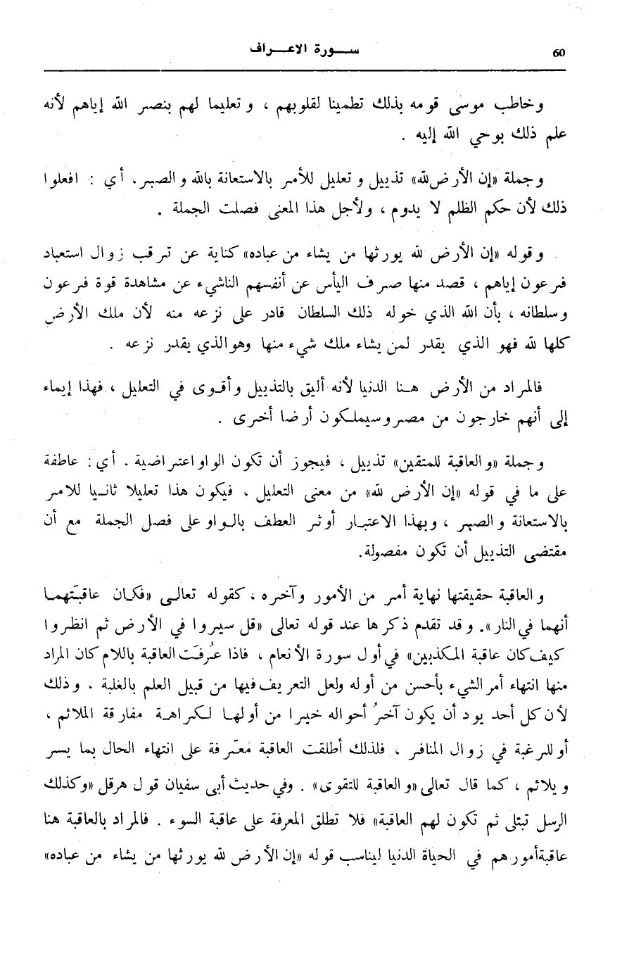 وَجُمْلَةُ: وَالْعاقِبَةُ لِلْمُتَّقِينَ تَذْيِيلٌ، فَيَجُوزُ أَنْ تَكُونَ الْوَاوُ اعْتِرَاضِيَّةً، أَيْ: عَاطِفَةً عَلَى مَا فِي قَوْلِهِ: إِنَّ الْأَرْضَ لِلَّهِ مِنْ مَعْنَى التَّعْلِيلِ، فَيَكُونُ هَذَا تَعْلِيلًا ثَانِيًا لِلْأَمْرِ بِالِاسْتِعَانَةِ وَالصَّبْرِ، وَبِهَذَا الِاعْتِبَارِ أُوثِرَ الْعَطْفُ بِالْوَاوِ عَلَى فَصْلِ الْجُمْلَةِ مَعَ أَنَّ مُقْتَضَى التَّذْيِيلِ أَنْ تَكُونَ مَفْصُولَةً.