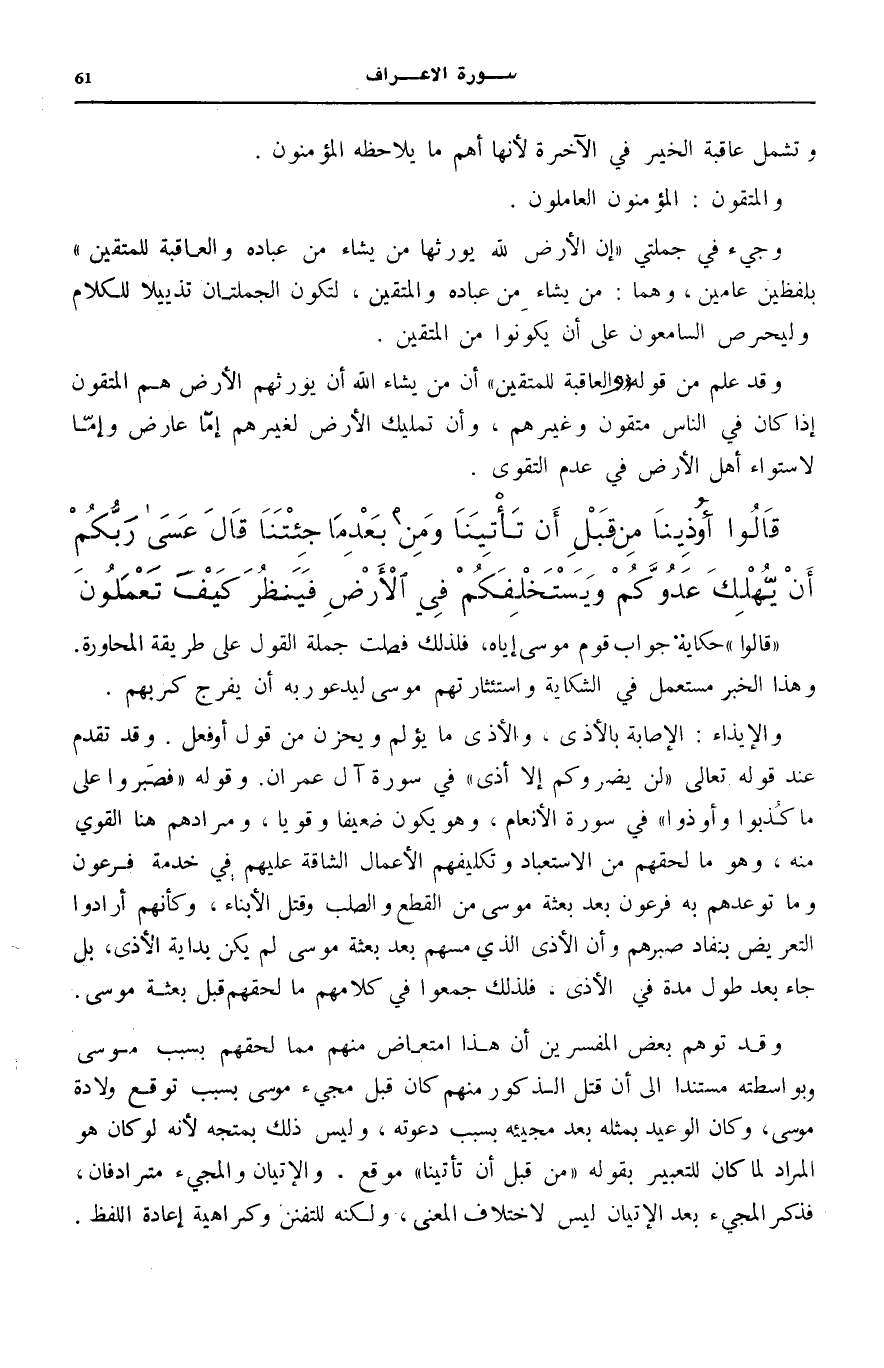 مُسْتَنِدًا إِلَى أَنَّ قَتْلَ الذُّكُورِ مِنْهُمْ كَانَ قَبْلَ مَجِيءِ مُوسَى بِسَبَبِ تَوَقُّعِ وِلَادَةِ مُوسَى، وَكَانَ الْوَعِيدُ بِمِثْلِهِ بَعْدَ مَجِيئِهِ بِسَبَبِ دَعْوَتِهِ، وَلَيْسَ ذَلِكَ بِمُتَّجِهٍ لِأَنَّهُ لَوْ كَانَ هُوَ الْمُرَادَ لَمَا كَانَ لِلتَّعْبِيرِ بِقَوْلِهِ: مِنْ قَبْلِ أَنْ تَأْتِيَنا مَوْقِعٌ، وَالْإِتْيَانُ وَالْمَجِيءُ مُتَرَادِفَانِ، فَذِكْرُ الْمَجِيءِ بَعْدَ الْإِتْيَانِ لَيْسَ لِاخْتِلَافِ الْمَعْنَى، وَلَكِنَّهُ لِلتَّفَنُّنِ وَكَرَاهِيَةِ إِعَادَةِ اللَّفْظِ.