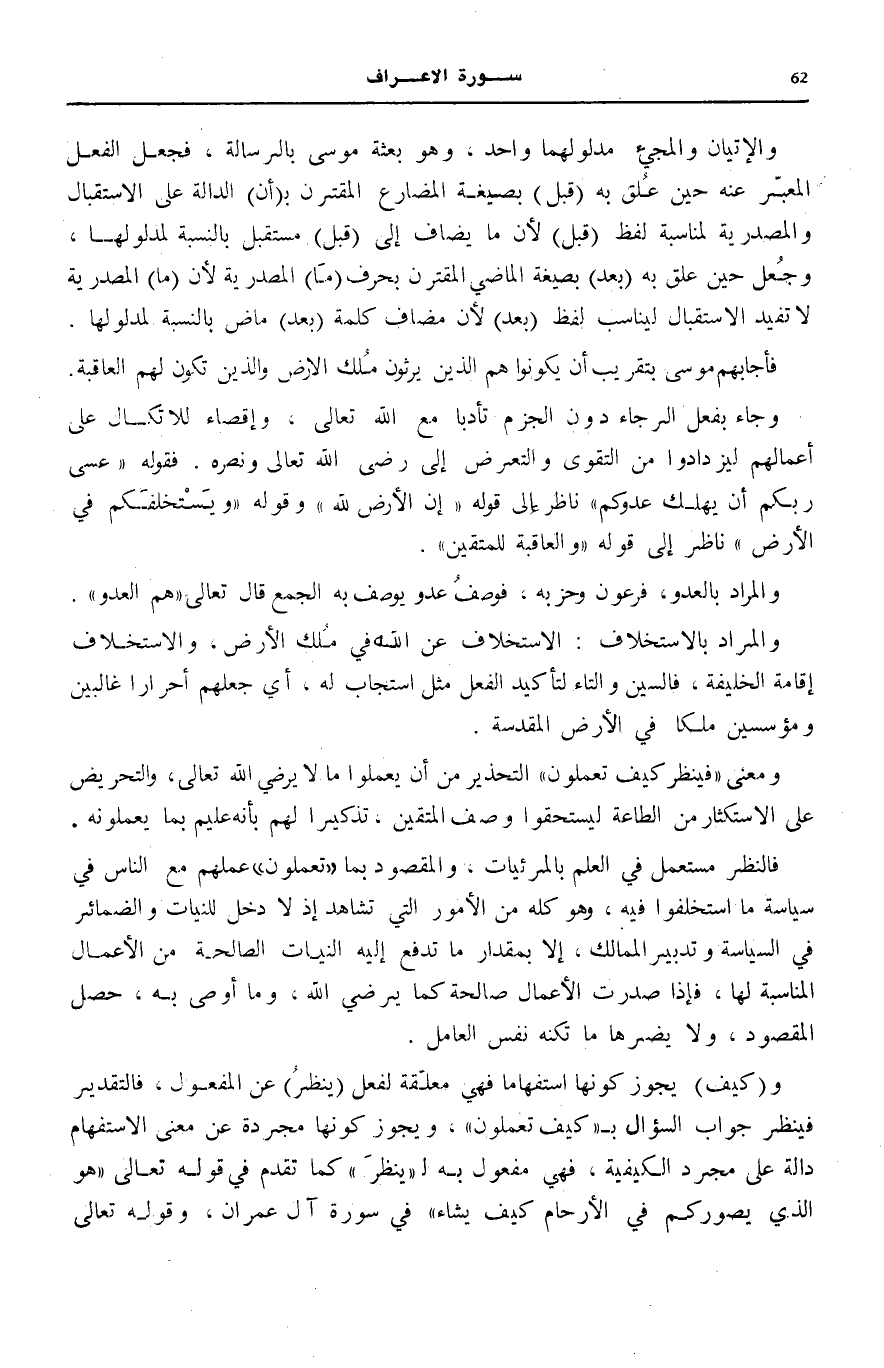 وَجَاءَ بِفِعْلِ الرَّجَاءِ دُونَ الْجَزْمِ تَأَدُّبًا مَعَ اللَّهِ تَعَالَى، وَإِقْصَاءً لِلِاتِّكَالِ عَلَى أَعْمَالِهِمْ لِيَزْدَادُوا مِنَ التَّقْوَى وَالتَّعَرُّضِ إِلَى رِضَى اللَّهِ تَعَالَى وَنَصْرِهِ. فَقَوْلُهُ: عَسى رَبُّكُمْ أَنْ يُهْلِكَ عَدُوَّكُمْ نَاظِرٌ إِلَى قَوْلِهِ: إِنَّ الْأَرْضَ لِلَّهِ [الْأَعْرَاف: 128] وَقَوْلُهُ: وَيَسْتَخْلِفَكُمْ فِي الْأَرْضِ نَاظِرٌ إِلَى قَوْلِهِ وَالْعاقِبَةُ لِلْمُتَّقِينَ [الْأَعْرَاف: 128] .