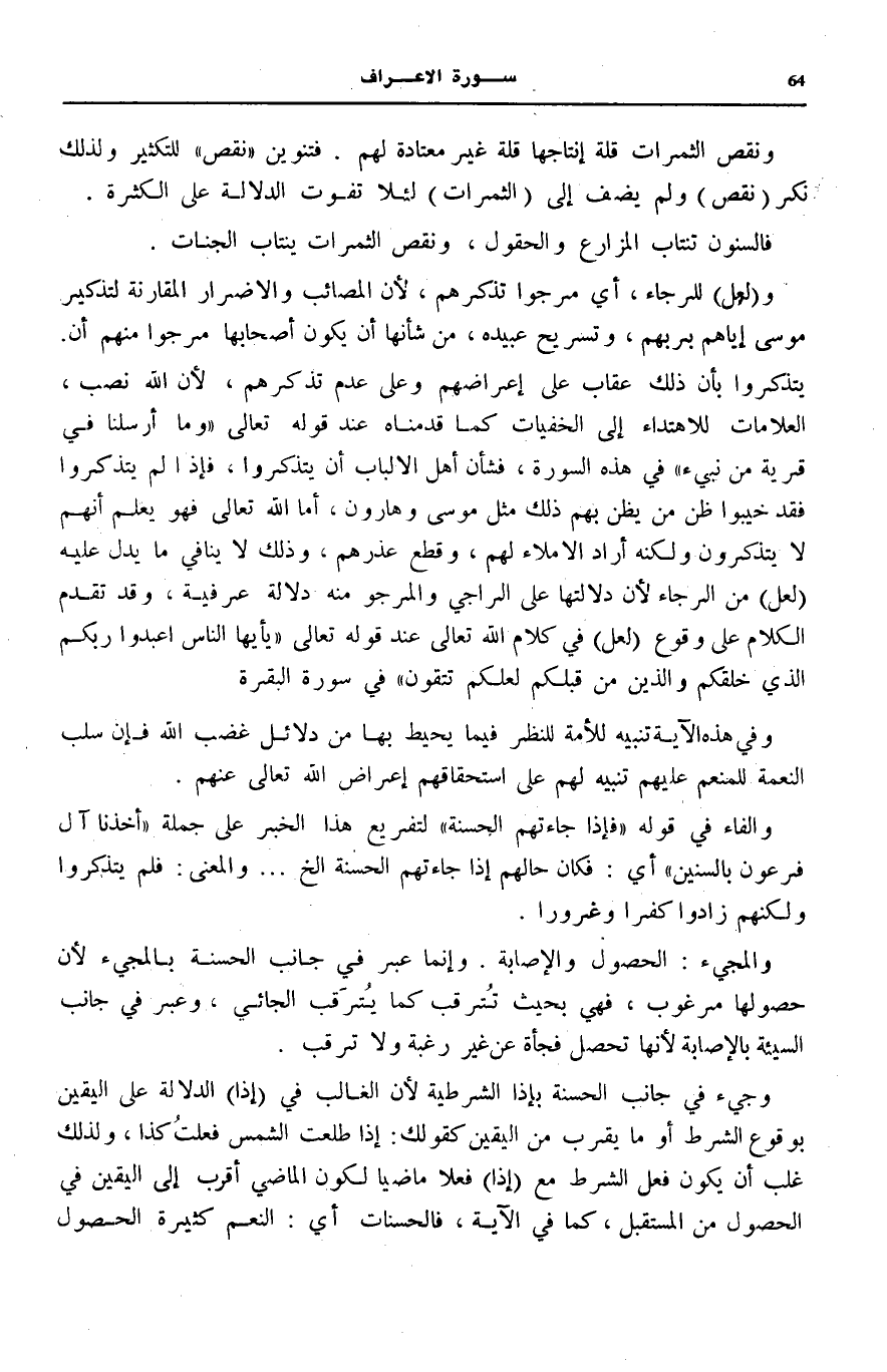 وَالْفَاءُ فِي قَوْلِهِ: فَإِذا جاءَتْهُمُ الْحَسَنَةُ لِتَفْرِيعِ هَذَا الْخَبَرِ عَلَى جُمْلَةِ أَخَذْنا آلَ فِرْعَوْنَ بِالسِّنِينَ أَيْ: فَكَانَ حَالُهُمْ إِذَا جَاءَتْهُمُ الْحَسَنَةُ إِلَخْ ... وَالْمَعْنَى: فَلَمْ يَتَذَكَّرُوا وَلَكِنَّهُمْ زَادُوا كُفْرًا وَغُرُورًا.