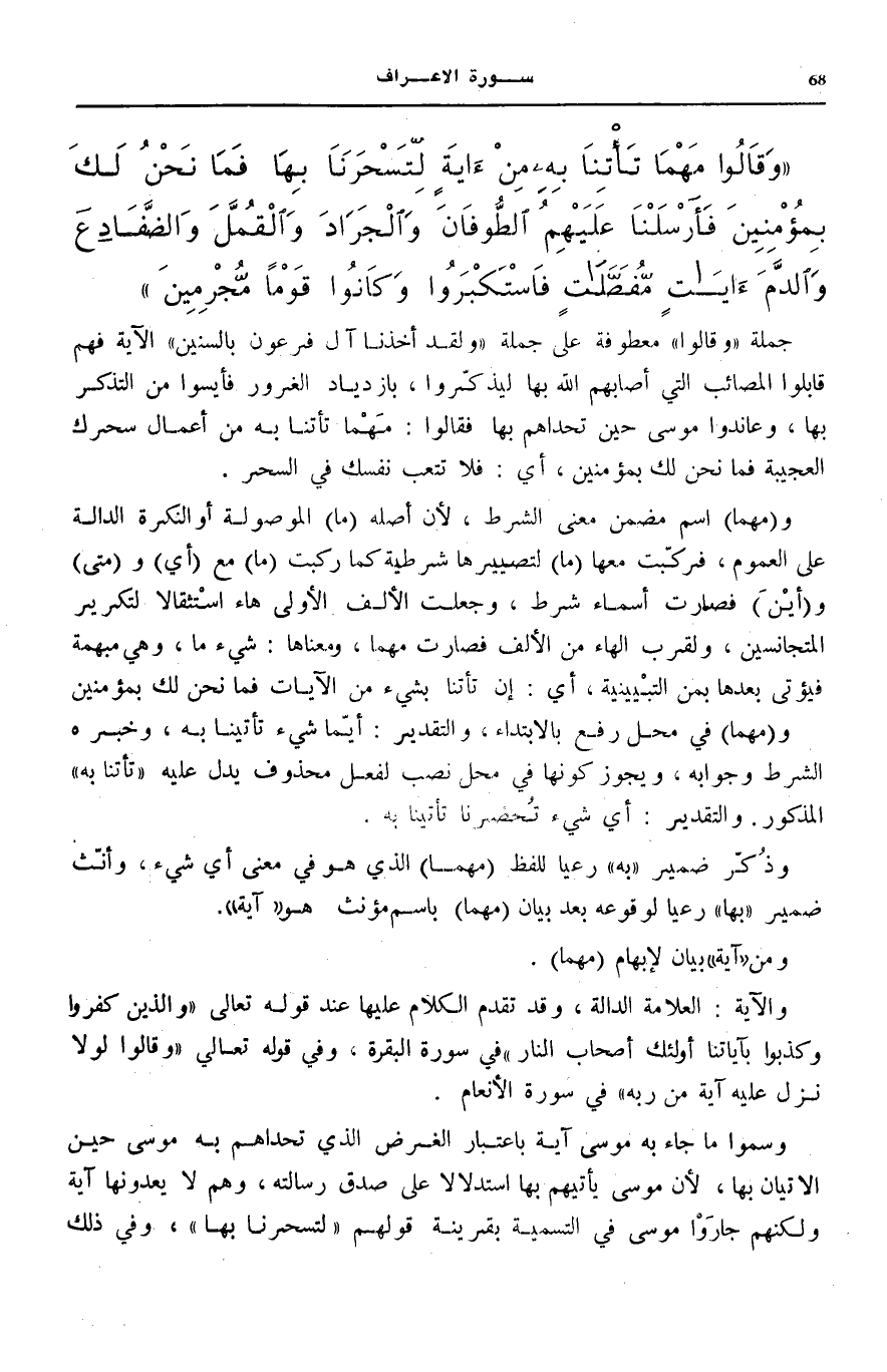 ومَهْما فِي مَحَلِّ رَفْعٍ بِالِابْتِدَاءِ، وَالتَّقْدِيرُ: أَيُّمَا شَيْءٍ تَأْتِينَا بِهِ، وَخَبَرُهُ الشَّرْطُ وَجَوَابُهُ، وَيَجُوزُ كَوْنُهَا فِي مَحَلِّ نَصْبٍ لِفِعْلٍ مَحْذُوفٍ يَدُلُّ عَلَيْهِ تَأْتِنا بِهِ الْمَذْكُورُ.