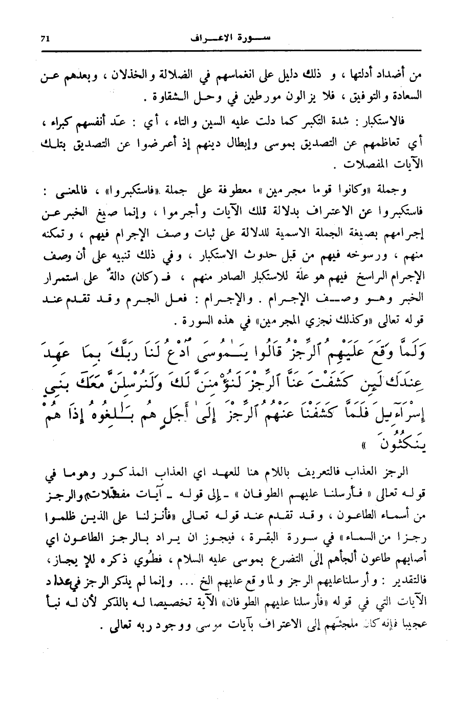الرِّجْزُ الْعَذَابُ فَالتَّعْرِيفُ بِاللَّامِ هُنَا لِلْعَهْدِ أَيِ الْعَذَابُ الْمَذْكُورُ وَهُوَ مَا فِي قَوْلِهِ تَعَالَى: فَأَرْسَلْنا عَلَيْهِمُ الطُّوفانَ- إِلَى قَوْلِهِ- آياتٍ مُفَصَّلاتٍ [الْأَعْرَاف: 133] وَالرِّجْزُ مِنْ أَسْمَاءِ الطَّاعُونِ، وَقَدْ تقدم عِنْد قَوْلهم تَعَالَى: فَأَنْزَلْنا عَلَى الَّذِينَ ظَلَمُوا رِجْزاً مِنَ السَّماءِ فِي سُورَةِ الْبَقَرَةِ [59] ، فَيَجُوزُ أَنْ يُرَادَ بِالرِّجْزِ الطَّاعُونُ أَيْ أَصَابَهُمْ طَاعُونٌ أَلْجَأَهُمْ إِلَى التَّضَرُّعِ بِمُوسَى عَلَيْهِ السَّلَامُ، فَطُوِيَ ذِكْرُهُ لِلْإِيجَازِ، فَالتَّقْدِيرُ: وَأَرْسَلْنَا عَلَيْهِمُ الرِّجْزَ وَلَمَّا وَقَعَ عَلَيْهِمْ إِلَخ ... وَإِنَّمَا لم يُذْكَرُ الرِّجْزُ فِي عِدَادِ الْآيَاتِ الَّتِي فِي قَوْلِهِ: