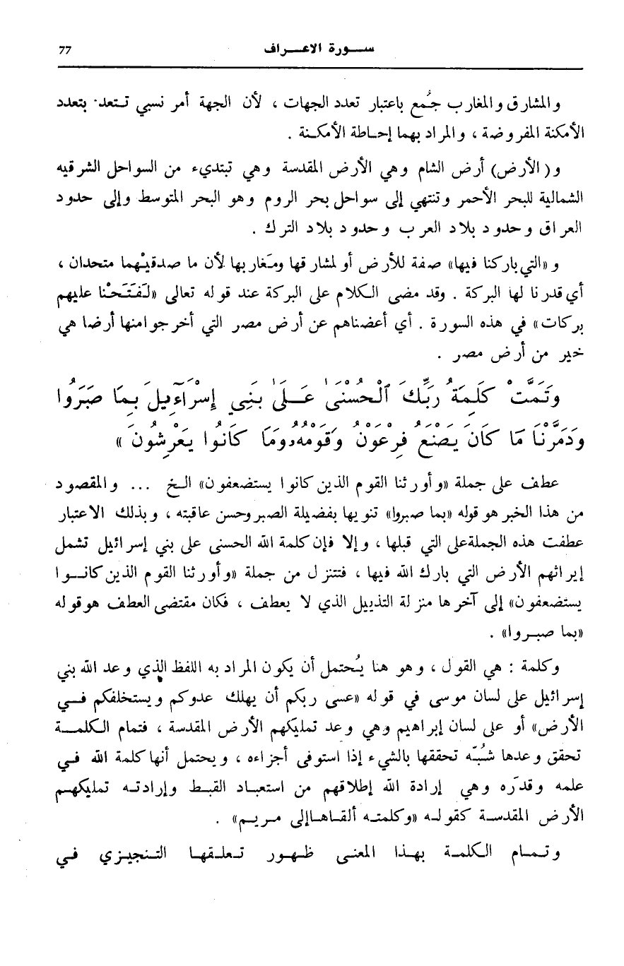 إِيرَاثَهُمُ الْأَرْضَ الَّتِي بَارَكَ اللَّهُ فِيهَا، فَتَتَنَزَّلُ مِنْ جُمْلَةِ: وَأَوْرَثْنَا الْقَوْمَ الَّذِينَ كانُوا يُسْتَضْعَفُونَ إِلَى آخِرِهَا مَنْزِلَةَ التَّذْيِيلِ الَّذِي لَا يُعْطَفُ، فَكَانَ مُقْتَضَى الْعَطْفِ هُوَ قَوْلُهُ بِما صَبَرُوا.
