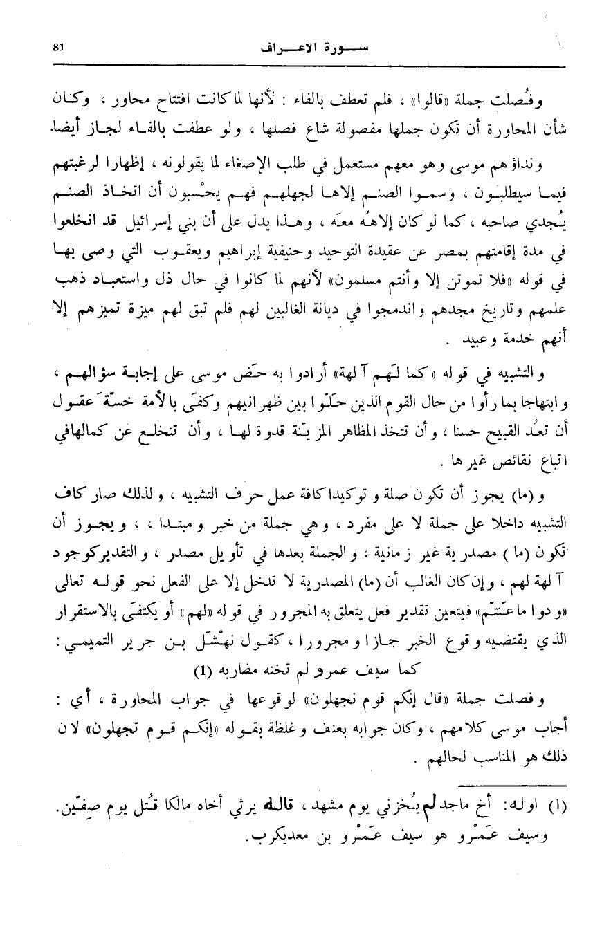 كَمَا سَيْفُ عَمْرٍو لَمْ تَخُنْهُ مَضَارِبُهُ (¬1) وَفُصِلَتْ جُمْلَةُ قالَ إِنَّكُمْ قَوْمٌ تَجْهَلُونَ لِوُقُوعِهَا فِي جَوَابِ الْمُحَاوَرَةِ، أَيْ: أَجَابَ