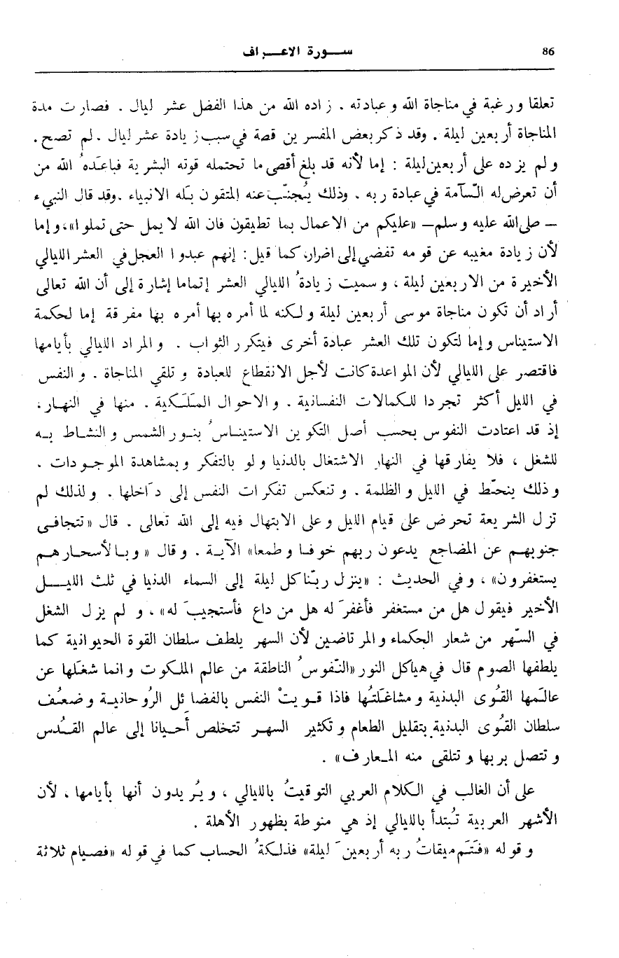 وَالنَّفْسُ فِي اللَّيْلِ أَكْثَرُ تَجَرُّدًا لِلْكَمَالَاتِ النَّفْسَانِيَّةِ، وَالْأَحْوَالِ الْمَلَكِيَّةِ، مِنْهَا فِي النَّهَارِ، إِذْ قَدِ اعْتَادَتِ النُّفُوسُ بِحَسَبِ أصل التكوين الاستيناس بِنُورِ الشَّمْسِ وَالنَّشَاطَ بِهِ لِلشُّغْلِ، فَلَا يُفَارِقُهَا فِي النَّهَارِ الِاشْتِغَالُ بِالدُّنْيَا وَلَوْ بِالتَّفَكُّرِ وَبِمُشَاهَدَةِ الْمَوْجُودَاتِ، وَذَلِكَ يَنْحَطُّ فِي اللَّيْلِ وَالظُّلْمَةِ، وَتَنْعَكِسُ تَفَكُّرَاتُ النَّفْسِ إِلَى دَاخِلِهَا، وَلِذَلِكَ لَمْ تَزَلِ الشَّرِيعَةُ تُحَرِّضُ عَلَى قِيَامِ اللَّيْلِ وَعَلَى الِابْتِهَالِ فِيهِ إِلَى اللَّهِ تَعَالَى، قَالَ: تَتَجافى جُنُوبُهُمْ عَنِ الْمَضاجِعِ يَدْعُونَ رَبَّهُمْ خَوْفاً وَطَمَعاً [السَّجْدَة: 16] الْآيَةَ، وَقَالَ: وَبِالْأَسْحارِ هُمْ يَسْتَغْفِرُونَ،