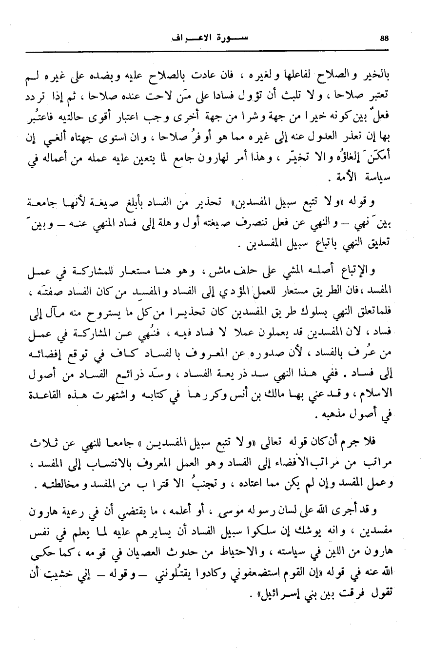 بِالْخَيْرِ وَالصَّلَاحِ لِفَاعِلِهَا وَلِغَيْرِهِ، فَإِنْ عَادَتْ بِالصَّلَاحِ عَلَيْهِ وَبِضِدِّهِ عَلَى غَيْرِهِ لَمْ تُعْتَبَرْ صَلَاحًا، وَلَا تلبث أَن تؤول فَسَادًا عَلَى مَنْ لَاحَتْ عِنْدَهُ صَلَاحًا، ثُمَّ إِذَا تَرَدَّدَ فِعْلٌ بَيْنَ كَوْنِهِ خَيْرًا مِنْ جِهَةٍ وَشَرًّا مِنْ جِهَةٍ أُخْرَى وَجَبَ اعْتِبَارُ أَقْوَى حَالَتَيْهِ فَاعْتُبِرَ بِهَا إِنْ تَعَذَّرَ الْعُدُولُ عَنْهُ إِلَى غَيْرِهِ مِمَّا هُوَ أَوْفَرُ صَلَاحًا، وَإِنِ اسْتَوَى جِهَتَاهُ أُلْغِيَ إِنْ أَمْكَنَ إِلْغَاؤُهُ وَإِلَّا تَخَيَّرَ، وَهَذَا أَمْرٌ لِهَارُونَ جَامِعٌ لِمَا يَتَعَيَّنُ عَلَيْهِ عَمَلُهُ مِنْ أَعْمَالِهِ فِي سِيَاسَةِ الْأُمَّةِ.