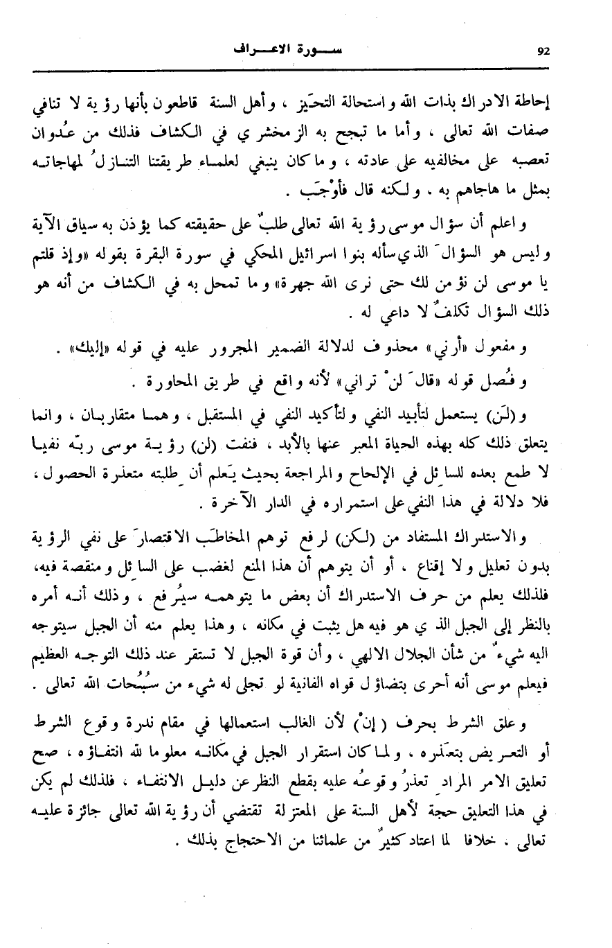 إِحَاطَةِ الْإِدْرَاكِ بِذَاتِ اللَّهِ وَاسْتِحَالَةِ التَّحَيُّزِ، وَأَهْلُ السُّنَّةِ قَاطِعُونَ بِأَنَّهَا رُؤْيَةٌ لَا تُنَافِي صِفَاتِ اللَّهِ تَعَالَى، وَأَمَّا مَا تَبَجَّحَ بِهِ الزَّمَخْشَرِيُّ فِي «الْكَشَّافِ» فَذَلِكَ مِنْ عُدْوَانِ تَعَصُّبِهِ عَلَى مُخَالِفِيهِ عَلَى عَادَتِهِ، وَمَا كَانَ يَنْبَغِي لِعُلَمَاءِ طَرِيقَتِنَا التَّنَازُلُ لِمُهَاجَاتِهِ بِمِثْلِ مَا هَاجَاهُمْ بِهِ، وَلَكِنَّهُ قَالَ فَأَوْجَبَ.