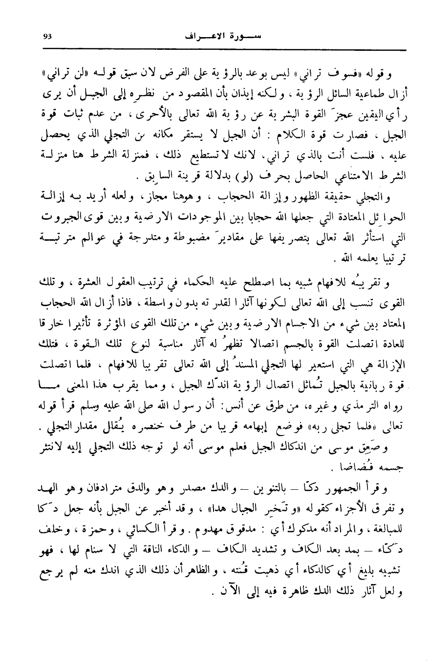 وَتَقْرِيبُهُ لِلْإِفْهَامِ شَبِيهٌ بِمَا اصْطَلَحَ عَلَيْهِ الْحُكَمَاءُ فِي تَرْتِيبِ الْعُقُولِ الْعَشَرَةِ، وَتِلْكَ الْقُوَى تُنْسَبُ إِلَى اللَّهِ تَعَالَى لِكَوْنِهَا آثَارًا لِقُدْرَتِهِ بِدُونِ وَاسِطَةٍ، فَإِذَا أَزَالَ اللَّهُ الْحِجَابَ الْمُعْتَادَ بَيْنَ شَيْءٍ مِنَ الْأَجْسَامِ الْأَرْضِيَّةِ وَبَيْنَ شَيْءٍ مِنْ تِلْكَ الْقُوَى الْمُؤَثِّرَةِ تَأْثِيرًا خَارِقًا لِلْعَادَةِ اتَّصَلَتِ الْقُوَّةُ بِالْجِسْمِ اتِّصَالًا تَظْهَرُ لَهُ آثَارٌ مُنَاسِبَةٌ لِنَوْعِ تِلْكَ الْقُوَّةِ، فَتِلْكَ الْإِزَالَةُ هِيَ الَّتِي اسْتُعِيرَ لَهَا التَّجَلِّي الْمُسْنَدُ إِلَى اللَّهِ تَعَالَى تَقْرِيبًا لِلْأَفْهَامِ، فَلَمَّا اتَّصَلَتْ قُوَّةٌ رَبَّانِيَّةٌ بِالْجَبَلِ تُمَاثِلُ اتِّصَالَ الرُّؤْيَةِ انْدَكَّ الْجَبَلُ، وَمِمَّا يُقَرِّبُ هَذَا الْمَعْنَى، مَا