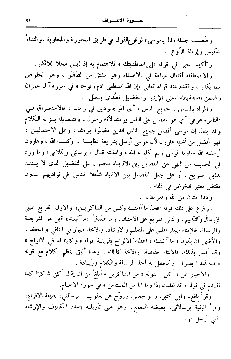 وَالْمُرَادُ بِالنَّاسِ: جَمِيعُ النَّاسِ، أَيِ الْمَوْجُودِينَ فِي زَمَنِهِ، فَالِاسْتِغْرَاقُ فِي النَّاسِ عُرْفِيُّ أَيْ هُوَ مُفَضَّلٌ عَلَى النَّاسِ يَوْمَئِذٍ لِأَنَّهُ رَسُولٌ، وَلِتَفْضِيلِهِ بِمَزِيَّةِ الْكَلَامِ، وَقَدْ يُقَالُ إِنَّ مُوسَى أَفْضَلُ جَمِيعِ النَّاسِ الَّذِينَ مَضَوْا يَوْمَئِذٍ، وَعَلَى الِاحْتِمَالَيْنِ: فَهُوَ أَفْضَلُ مِنْ أَخِيهِ هَارُونَ، لِأَنَّ مُوسَى أُرْسِلَ بِشَرِيعَةٍ عَظِيمَةٍ، وَكَلَّمَهُ اللَّهُ، وَهَارُونَ أَرْسَلَهُ اللَّهُ مُعَاوِنًا لِمُوسَى وَلَمْ يُكَلِّمْهُ اللَّهُ، وَلِذَلِكَ قَالَ: بِرِسَالَتِي وَبِكَلَامِي وَمَا وَرَدَ فِي الْحَدِيثِ مِنَ النَّهْيِ عَنِ التَّفْضِيلِ بَيْنَ الْأَنْبِيَاءِ مَحْمُولٌ عَلَى التَّفْضِيلِ الَّذِي لَا يَسْتَنِدُ لِدَلِيلٍ صَرِيحٍ، أَوْ عَلَى جَعْلِ التَّفْضِيلِ بَيْنَ الْأَنْبِيَاءِ شُغُلًا لِلنَّاسِ فِي نَوَادِيهِمْ بِدُونِ مُقْتَضٍ مُعْتَبَرٍ لِلْخَوْضِ فِي ذَلِكَ. وَهَذَا امْتِنَانٌ مِنَ اللَّهِ وَتَعْرِيفٌ.