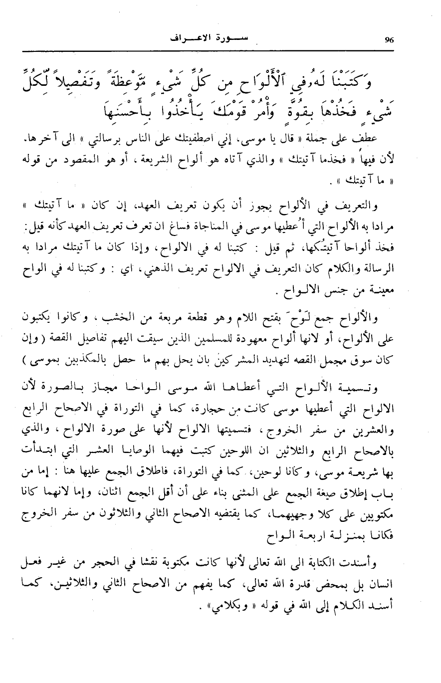 وَالتَّعْرِيفُ فِي الْأَلْوَاحِ يَجُوزُ أَنْ يَكُونَ تَعْرِيفَ الْعَهْدِ، إِنْ كَانَ مَا آتَيْتُكَ مُرَادًا بِهِ الْأَلْوَاحُ الَّتِي أُعْطِيَهَا مُوسَى فِي الْمُنَاجَاةِ، فَسَاغَ أَنْ تُعَرَّفَ تَعْرِيفَ الْعَهْدِ، كَأَنَّهُ قِيلَ: فَخُذْ أَلْوَاحًا آتَيْتُكَهَا، ثُمَّ قِيلَ: كتبنَا لَهُ فِي الْأَلْوَاحِ، وَإِذَا كَانَ مَا آتَيْتُكَ مُرَادًا بِهِ الرِّسَالَةُ وَالْكَلَامُ كَانَ التَّعْرِيفُ فِي الْأَلْوَاحِ تَعْرِيفَ الذِّهْنِي، أَيْ: وَكَتَبْنَا لَهُ فِي أَلْوَاح مُعَيَّنَةٍ مِنْ جِنْسِ الْأَلْوَاحِ.