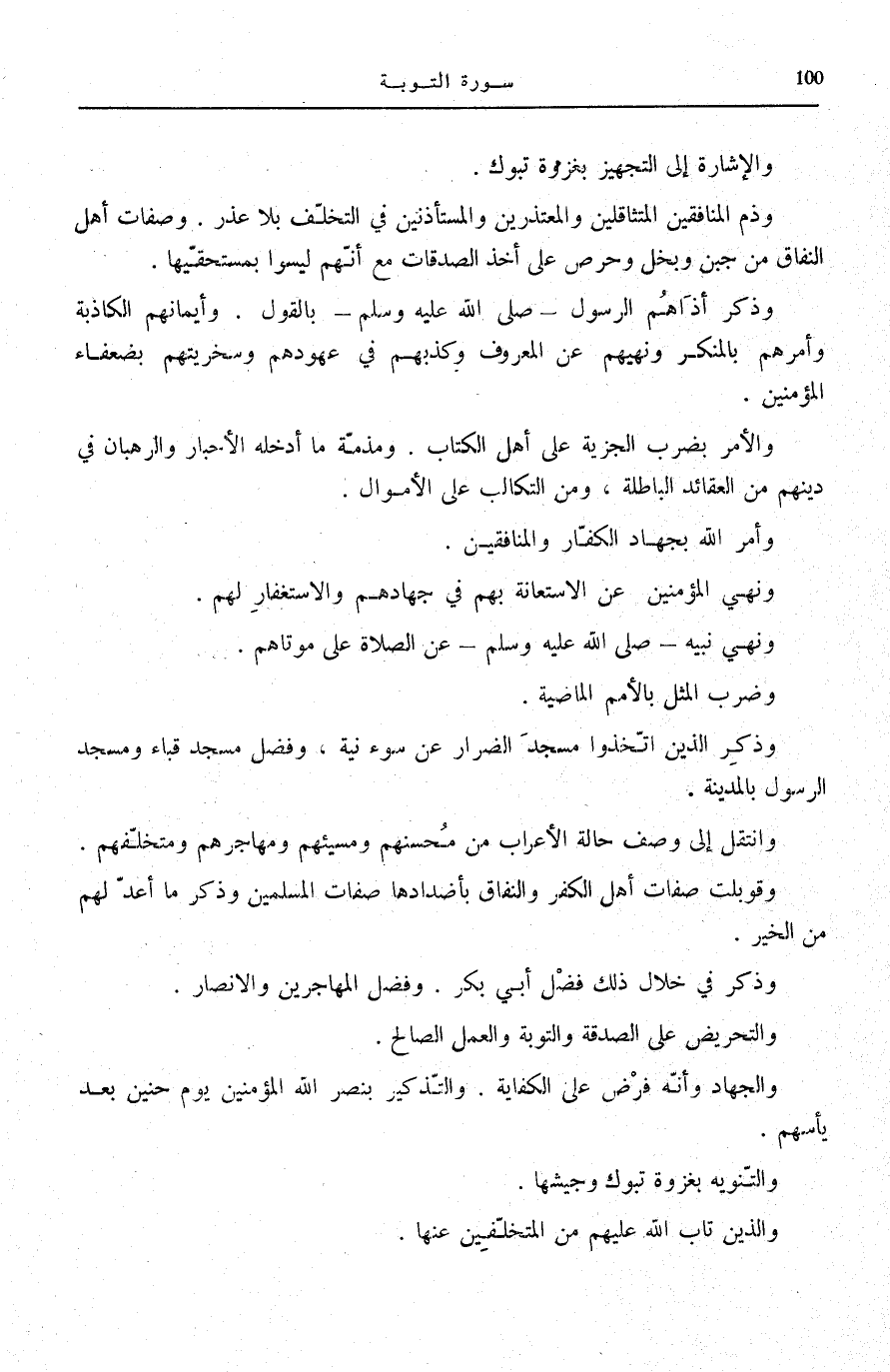 وَذَمِّ الْمُنَافِقِينَ الْمُتَثَاقِلِينَ وَالْمُعْتَذِرِينَ وَالْمُسْتَأْذِنِينَ فِي التَّخَلُّفِ بِلَا عُذْرٍ. وَصِفَاتِ أَهْلِ النِّفَاقِ مِنْ جُبْنٍ وَبُخْلٍ وَحِرْصٍ عَلَى أَخْذِ الصَّدَقَاتِ مَعَ أَنَّهُمْ لَيْسُوا بِمُسْتَحِقِّيهَا.