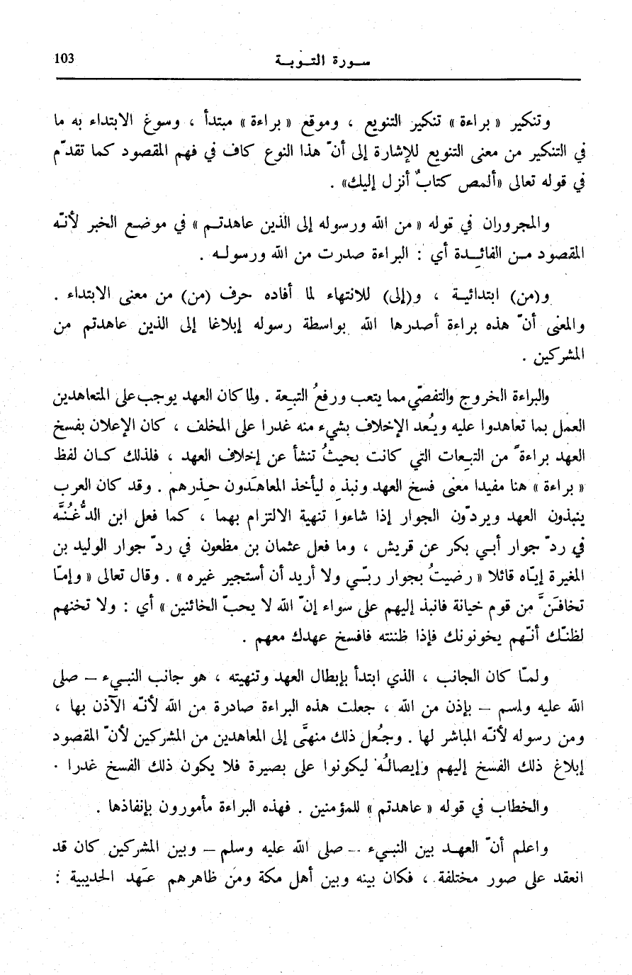 وَالْبَرَاءَةُ الْخُرُوجُ وَالتَّفَصِّي مِمَّا يُتْعِبُ وَرَفْعُ التَّبِعَةِ. وَلَمَّا كَانَ الْعَهْدُ يُوجِبُ عَلَى الْمُتَعَاهِدِينَ الْعَمَلَ بِمَا تَعَاهَدُوا عَلَيْهِ وَيُعَدُّ الْإِخْلَافُ بِشَيْءٍ مِنْهُ غَدْرًا عَلَى الْمُخْلِفِ، كَانَ الْإِعْلَانُ بِفَسْخِ الْعَهْدِ بَرَاءَةً مِنَ التَّبِعَاتِ الَّتِي كَانَتْ بِحَيْثُ تَنْشَأُ عَنْ إِخْلَافِ الْعَهْدِ، فَلِذَلِكَ كَانَ لَفْظُ بَراءَةٌ هُنَا مُفِيدًا مَعْنَى فَسْخِ الْعَهْدِ وَنَبْذِهِ لِيَأْخُذَ الْمُعَاهِدُونَ حِذْرَهُمْ. وَقَدْ كَانَ الْعَرَبُ يَنْبِذُونَ الْعَهْدَ وَيَرُدُّونَ الْجِوَارَ إِذَا شَاءُوا تَنْهِيَةَ الِالْتِزَامِ بِهِمَا، كَمَا فَعَلَ ابْنُ الدُّغُنَّةِ فِي رَدِّ جِوَارِ أَبِي بَكْرٍ عَنْ قُرَيْشٍ، وَمَا فَعَلَ عُثْمَانُ بْنُ مَظْعُونٍ فِي رَدِّ جِوَارِ الْوَلِيدِ بْنِ الْمُغِيرَةِ إِيَّاهُ قَائِلًا: «رَضِيتُ بِجِوَارِ رَبِّي وَلَا أُرِيدُ أَنْ أَسْتَجِيرَ غَيْرَهُ» . وَقَالَ تَعَالَى: وَإِمَّا تَخافَنَّ مِنْ قَوْمٍ خِيانَةً فَانْبِذْ إِلَيْهِمْ عَلى سَواءٍ إِنَّ اللَّهَ لَا يُحِبُّ الْخائِنِينَ [الْأَنْفَال: 58] أَيْ: وَلَا تَخُنْهُمْ لِظَنِّكَ أَنَّهُمْ يَخُونُونَكَ فَإِذَا ظَنَنْتَهُ فَافْسَخْ عَهْدَكَ مَعَهُمْ.