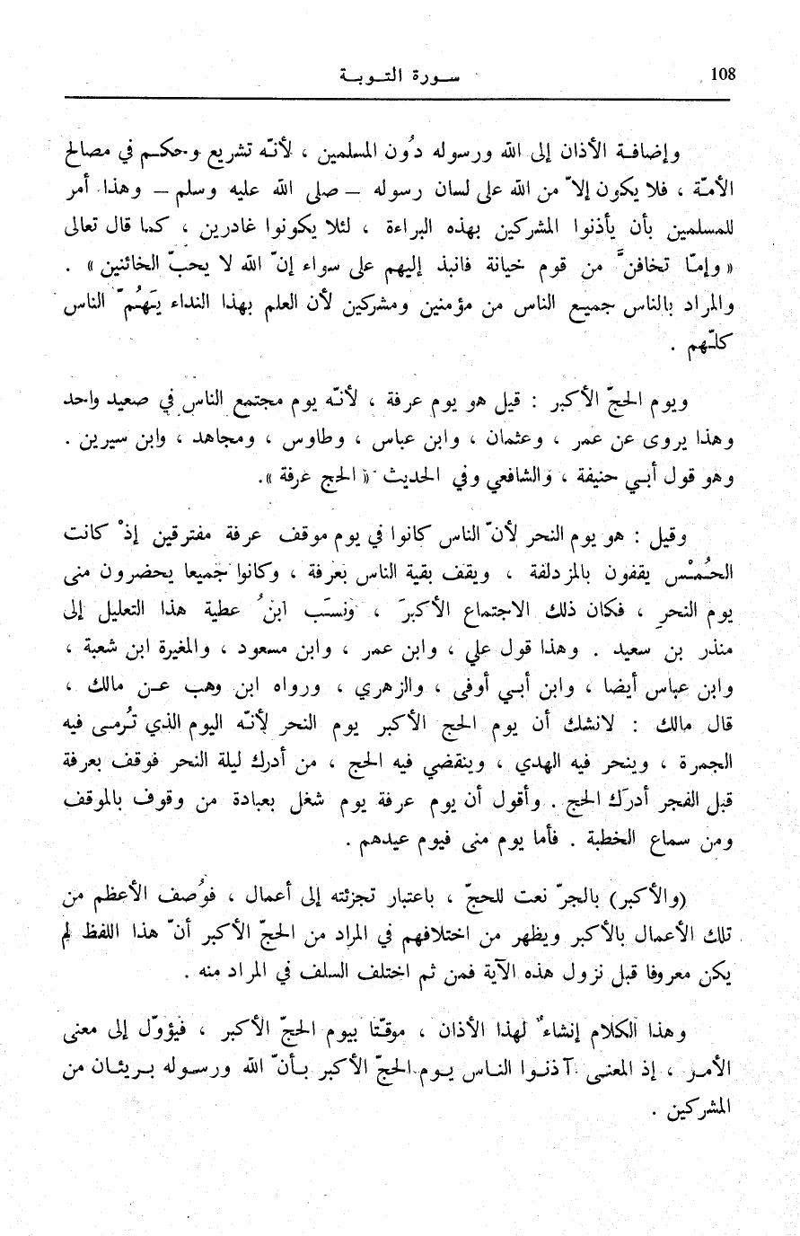 وَيَوْمُ الْحَجِّ الْأَكْبَرِ: قِيلَ هُوَ يَوْمُ عَرَفَةَ، لِأَنَّهُ يَوْمُ مُجْتَمَعِ النَّاسِ فِي صَعِيدٍ وَاحِدٍ، وَهَذَا يُرْوَى عَنْ عُمَرَ، وَعُثْمَانَ، وَابْن عَبَّاس، وطاووس، وَمُجَاهِدٍ، وَابْنِ سِيرِينَ. وَهُوَ قَوْلُ أَبِي حَنِيفَةَ، وَالشَّافِعِيِّ،