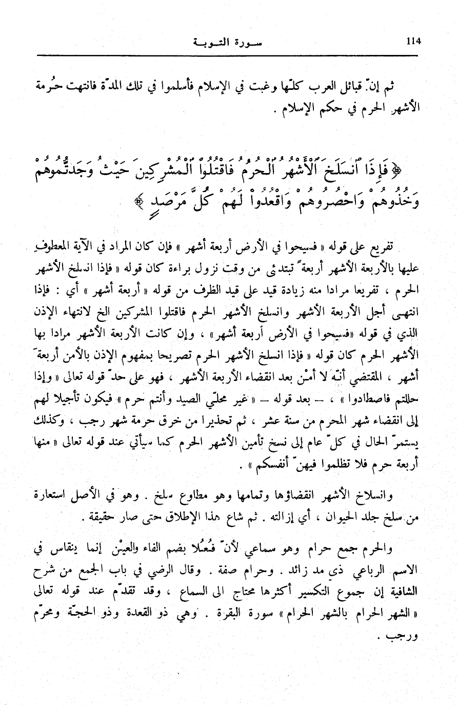 تَفْرِيعٌ عَلَى قَوْلِهِ: فَسِيحُوا فِي الْأَرْضِ أَرْبَعَةَ أَشْهُرٍ [التَّوْبَة: 2] فَإِنْ كَانَ الْمُرَادُ فِي الْآيَةِ الْمَعْطُوفِ عَلَيْهَا بِالْأَرْبَعَةِ الْأَشْهُرِ أَرْبَعَةً تَبْتَدِئُ مِنْ وَقْتِ نُزُولِ بَرَاءَةٌ كَانَ قَوْلُهُ: فَإِذَا انْسَلَخَ الْأَشْهُرُ الْحُرُمُ تَفْرِيعًا مُرَادًا مِنْهُ زِيَادَةُ قَيْدٍ عَلَى قَيْدِ الظّرْف من قَول: أَرْبَعَةَ أَشْهُرٍ [التَّوْبَة: 2] أَيْ: فَإِذَا انْتَهَى أَجَلُ الْأَرْبَعَةِ الْأَشْهُرِ وَانْسَلَخَ الْأَشْهُرُ الْحُرُمُ فَاقْتُلُوا الْمُشْرِكِينَ إِلَخْ لِانْتِهَاءِ الْإِذْنِ الَّذِي فِي قَوْلِهِ: فَسِيحُوا فِي الْأَرْضِ أَرْبَعَةَ أَشْهُرٍ [التَّوْبَة: 2] ، وَإِنْ كَانَتِ الْأَرْبَعَةُ الْأَشْهُرُ مُرَادًا بِهَا الْأَشْهُرُ الْحُرُمُ كَانَ قَوْلُهُ: فَإِذَا انْسَلَخَ الْأَشْهُرُ الْحُرُمُ تَصْرِيحًا بِمَفْهُومِ الْإِذْنِ بِالْأَمْنِ أَرْبَعَةَ أَشْهُرٍ، الْمُقْتَضِي أَنَّهُ لَا أَمْنَ بَعْدَ انْقِضَاءِ الْأَرْبَعَةِ الْأَشْهُرِ، فَهُوَ عَلَى حَدِّ قَوْلِهِ تَعَالَى: وَإِذا حَلَلْتُمْ فَاصْطادُوا [الْمَائِدَة: 2] ،- بَعْدَ قَوْلِهِ- غَيْرَ مُحِلِّي الصَّيْدِ وَأَنْتُمْ حُرُمٌ [الْمَائِدَة: 1] فَيَكُونُ تَأْجِيلًا لَهُمْ إِلَى انْقِضَاءِ شَهْرِ الْمُحَرَّمِ مِنْ سَنَةِ عَشْرٍ، ثُمَّ تَحْذِيرًا مِنْ خَرْقِ حُرْمَةِ شَهْرِ رَجَبٍ، وَكَذَلِكَ يَسْتَمِرُّ الْحَالُ فِي كُلِّ عَامٍ إِلَى نَسْخِ تَأْمِينِ الْأَشْهُرِ الْحُرُمِ كَمَا سَيَأْتِي عِنْدَ قَوْلِهِ تَعَالَى: مِنْها أَرْبَعَةٌ حُرُمٌ ... فَلا تَظْلِمُوا فِيهِنَّ أَنْفُسَكُمْ [التَّوْبَة: 36] .