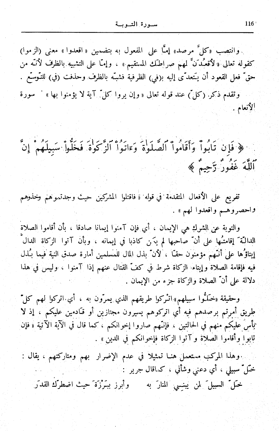 وَحَقِيقَةُ فَخَلُّوا سَبِيلَهُمْ اتْرُكُوا طَرِيقَهُمُ الَّذِي يَمُرُّونَ بِهِ، أَيِ اتْرُكُوا لَهُمْ كُلَّ طَرِيقٍ أُمِرْتُمْ بِرَصْدِهِمْ فِيهِ أَيِ اتْرُكُوهُمْ يَسِيرُونَ مُجْتَازِينَ أَوْ قَادِمِينَ عَلَيْكُمْ، إِذْ لَا بَأْسَ عَلَيْكُمْ مِنْهُمْ فِي الْحَالَتَيْنِ، فَإِنَّهُمْ صَارُوا إِخْوَانَكُمْ، كَمَا قَالَ فِي الْآيَةِ الْآتِيَةِ فَإِنْ تابُوا وَأَقامُوا الصَّلاةَ وَآتَوُا الزَّكاةَ فَإِخْوانُكُمْ فِي الدِّينِ [التَّوْبَة: 11] .