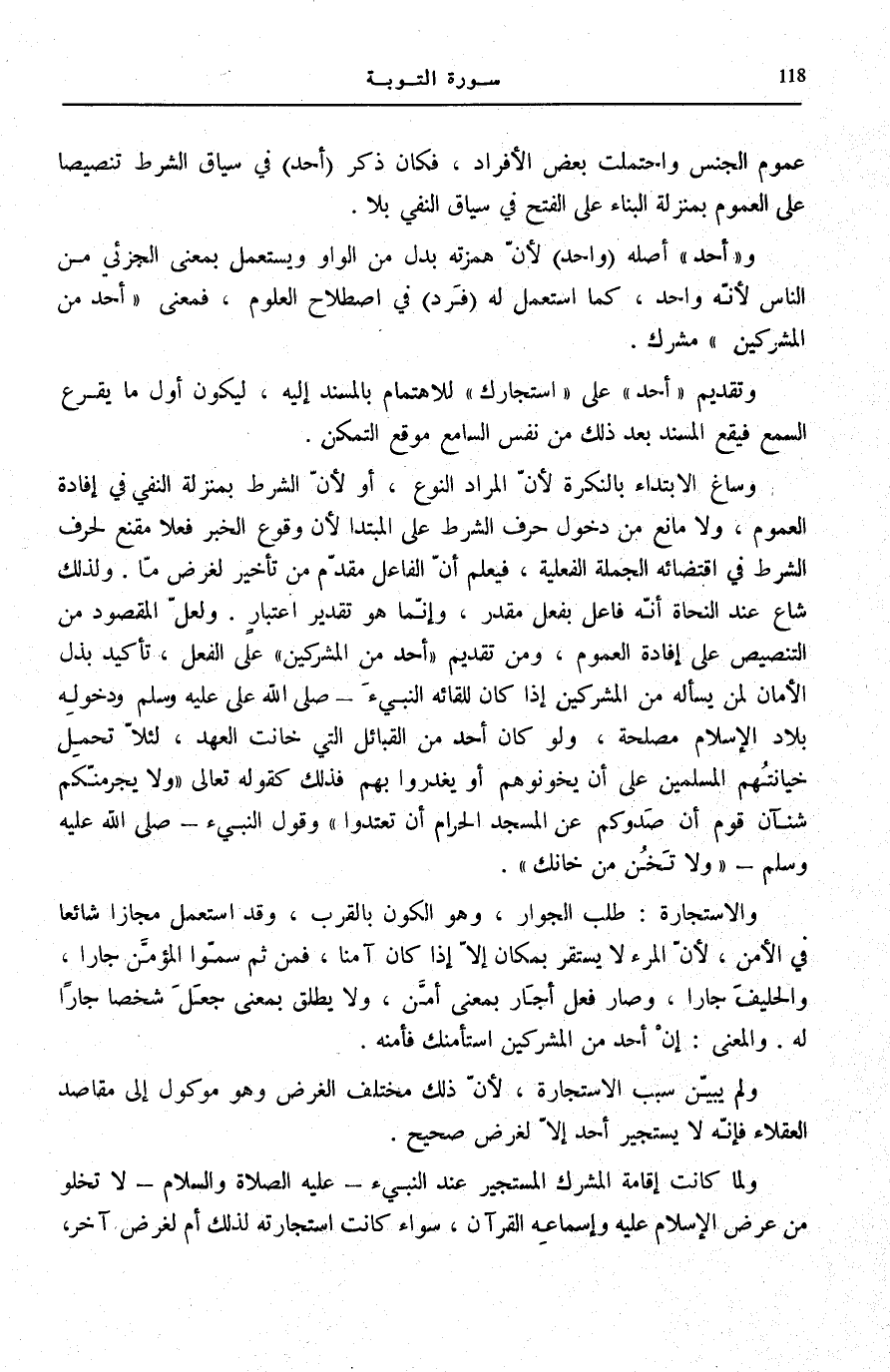 وَسَاغَ الِابْتِدَاءُ بِالنَّكِرَةِ لِأَنَّ الْمُرَادَ النَّوْعُ، أَوْ لِأَنَّ الشَّرْطَ بِمَنْزِلَةِ النَّفْيِ فِي إِفَادَةِ الْعُمُومِ، وَلَا مَانِعَ مِنْ دُخُولِ حَرْفِ الشَّرْطِ عَلَى الْمُبْتَدَأِ، لِأَنَّ وُقُوعَ الْخَبَرِ فِعْلًا مُقْنِعٌ لِحَرْفِ الشَّرْطِ فِي اقتضائه الْجُمْلَة الفعلية، فَيُعْلَمُ أَنَّ الْفَاعِلَ مُقَدَّمٌ مِنْ تَأْخِيرٍ لِغَرَضٍ مَا. وَلِذَلِكَ شَاعَ عِنْدَ النُّحَاةِ أَنَّهُ فَاعِلٌ بِفِعْلٍ مُقَدَّرٍ، وَإِنَّمَا هُوَ تَقْدِيرُ اعْتِبَارٍ. وَلَعَلَّ الْمَقْصُودَ مِنَ التَّنْصِيصِ عَلَى إِفَادَةِ الْعُمُومِ، وَمِنْ تَقْدِيمِ أَحَدٌ مِنَ الْمُشْرِكِينَ عَلَى الْفِعْلِ، تَأْكِيدُ بَذْلِ الْأَمَانِ لِمَنْ يَسْأَلُهُ مِنَ الْمُشْرِكِينَ إِذَا كَانَ لِلِقَائِهِ النَّبِيءَ صَلَّى اللهُ عَلَيْهِ وَسَلَّمَ وَدُخُولِهِ بِلَادَ الْإِسْلَامِ مَصْلَحَةٌ، وَلَوْ كَانَ أَحَدٌ مِنَ الْقَبَائِلِ الَّتِي خَانَتِ الْعَهْدَ، لِئَلَّا تَحْمِلَ خِيَانَتُهُمُ الْمُسْلِمِينَ عَلَى أَنْ يَخُونُوهُمْ أَوْ يَغْدِرُوا بِهِمْ فَذَلِكَ كَقَوْلِهِ تَعَالَى: وَلا يَجْرِمَنَّكُمْ شَنَآنُ قَوْمٍ أَنْ صَدُّوكُمْ عَنِ الْمَسْجِدِ الْحَرامِ أَنْ تَعْتَدُوا [الْمَائِدَة: 2] ،