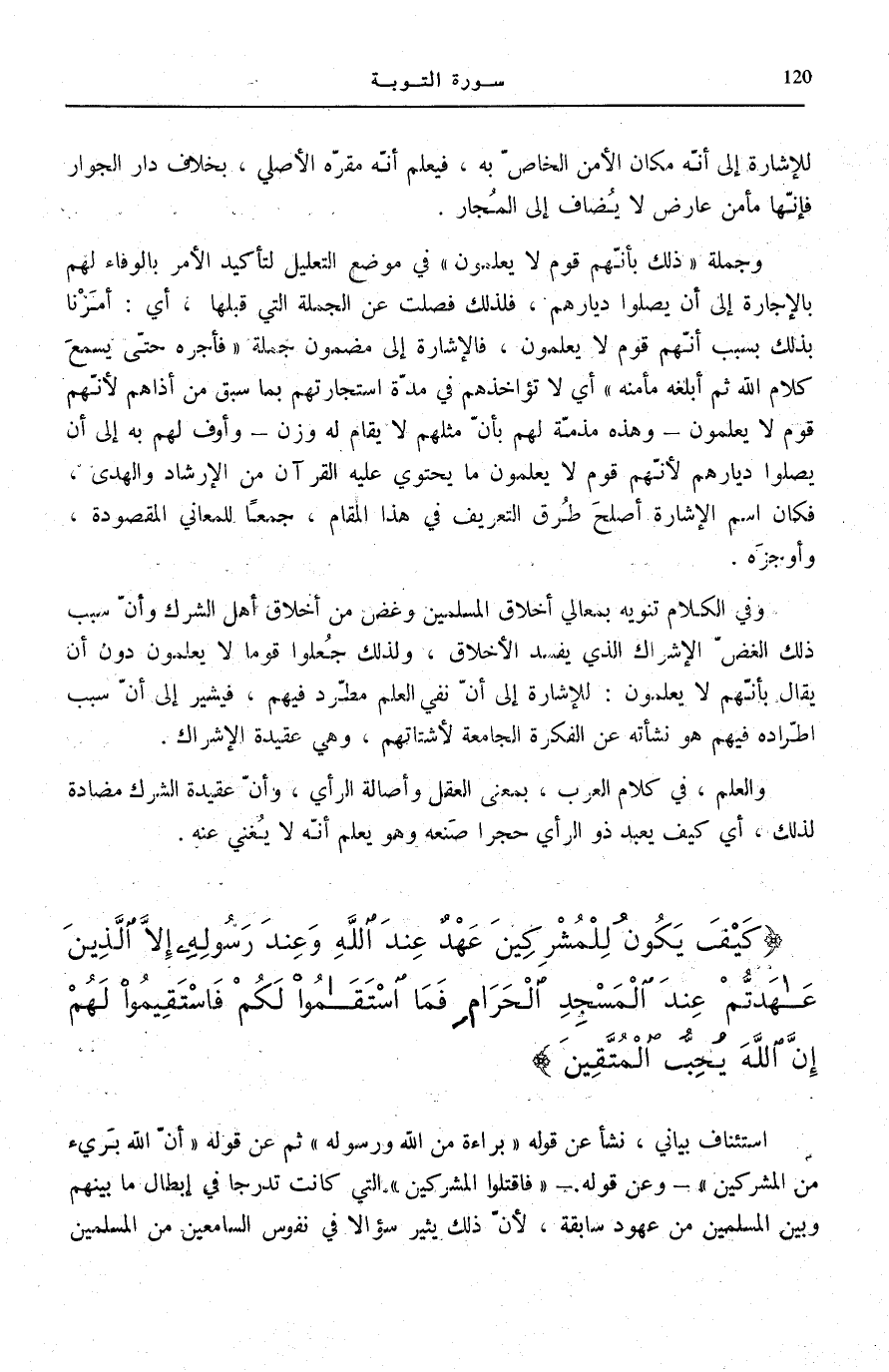اسْتِئْنَافٌ بَيَانِيٌّ، نَشَأَ عَنْ قَوْلِهِ: بَراءَةٌ مِنَ اللَّهِ وَرَسُولِهِ [التَّوْبَة: 1] ثُمَّ عَنْ قَوْلِهِ: أَنَّ اللَّهَ بَرِيءٌ مِنَ الْمُشْرِكِينَ [التَّوْبَة: 3]- وَعَنْ قَوْلِهِ- فَاقْتُلُوا الْمُشْرِكِينَ [التَّوْبَة: 5] الَّتِي كَانَتْ تَدَرُّجًا فِي إِبْطَالِ مَا بَيْنَهُمْ وَبَيْنَ الْمُسْلِمِينَ مِنْ عُهُودٍ سَابِقَةٍ، لِأَنَّ ذَلِكَ يُثِيرُ سُؤَالًا فِي نُفُوسِ السَّامِعِينَ مِنَ الْمُسْلِمِينَ