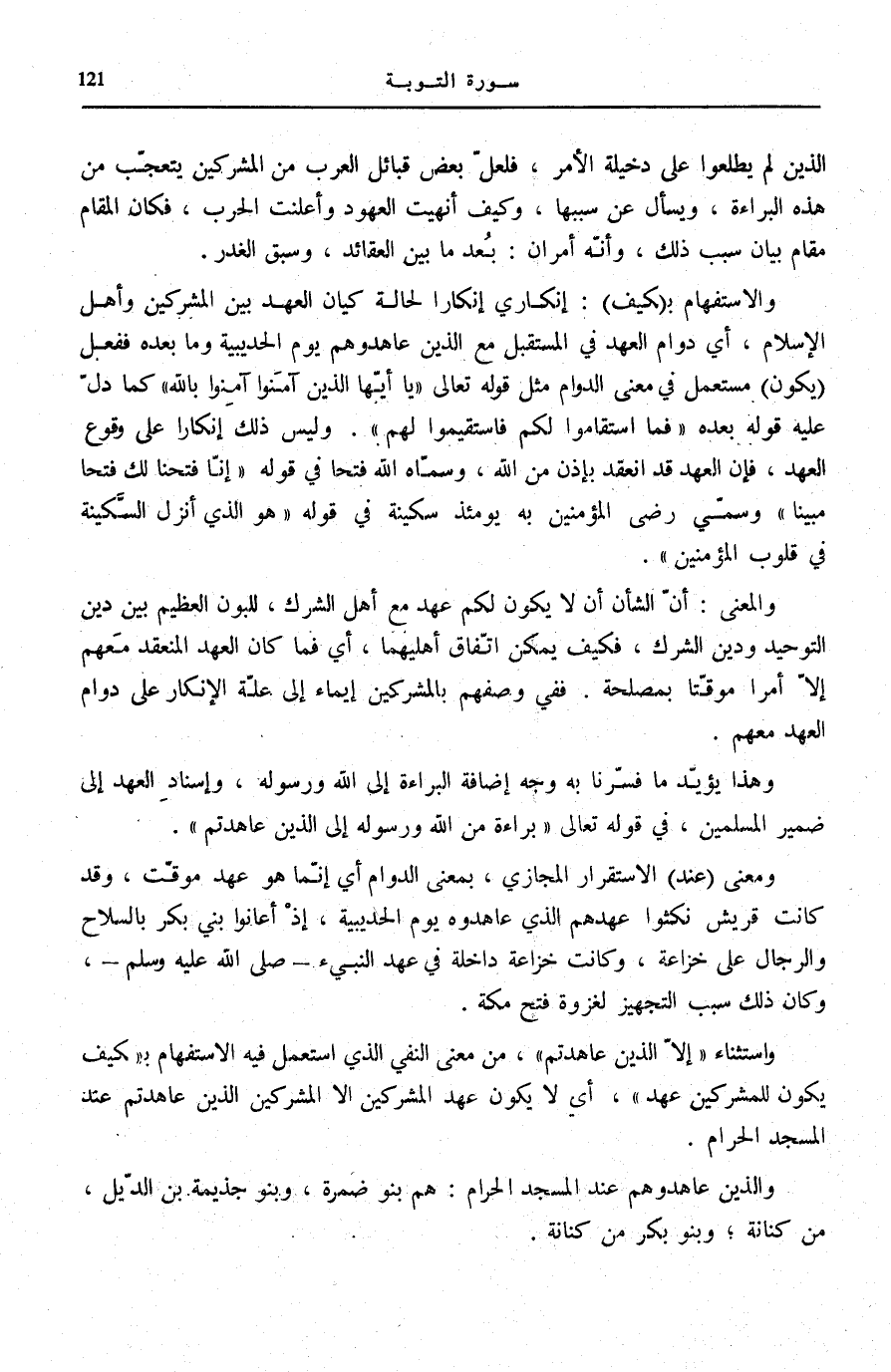 وَالِاسْتِفْهَامُ بِ كَيْفَ: إِنْكَارِيٌّ إِنْكَارًا لِحَالَةِ كِيَانِ الْعَهْدِ بَيْنَ الْمُشْرِكِينَ وَأَهْلِ الْإِسْلَامِ، أَيْ دَوَامُ الْعَهْدِ فِي الْمُسْتَقْبَلِ مَعَ الَّذِينَ عَاهَدُوهُمْ يَوْمَ الْحُدَيْبِيَةِ وَمَا بَعْدَهُ فَفِعْلَ يَكُونُ مُسْتَعْمَلٌ فِي مَعْنَى الدَّوَامِ مِثْلَ قَوْلِهِ تَعَالَى: يَا أَيُّهَا الَّذِينَ آمَنُوا آمِنُوا بِاللَّهِ [النِّسَاء: 136] كَمَا دَلَّ عَلَيْهِ قَوْلُهُ بَعْدَهُ فَمَا اسْتَقامُوا لَكُمْ فَاسْتَقِيمُوا لَهُمْ. وَلَيْسَ ذَلِكَ إِنْكَارًا عَلَى وُقُوعِ الْعَهْدِ، فَإِنَّ الْعَهْدَ قَدِ انْعَقَدَ بِإِذْنٍ مِنَ اللَّهِ، وَسَمَّاهُ اللَّهُ فَتْحًا فِي قَوْلِهِ: إِنَّا فَتَحْنا لَكَ فَتْحاً مُبِيناً [الْفَتْح: 1] وسمّي رضى الْمُؤْمِنِينَ بِهِ يَوْمَئِذٍ سَكِينَةً فِي قَوْلِهِ: هُوَ الَّذِي أَنْزَلَ السَّكِينَةَ فِي قُلُوبِ الْمُؤْمِنِينَ [الْفَتْح: 4] .