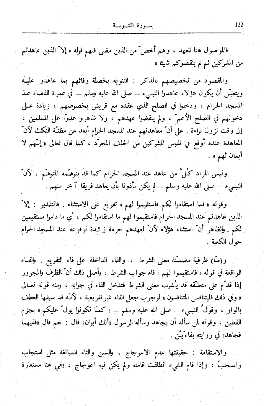 وَقَوْلُهُ: فَمَا اسْتَقامُوا لَكُمْ فَاسْتَقِيمُوا لَهُمْ تَفْرِيعٌ عَلَى الِاسْتِثْنَاءِ. فَالتَّقْدِيرُ: إِلَّا الَّذِينَ عَاهَدْتُمْ عِنْدَ الْمَسْجِدِ الْحَرَامِ فَاسْتَقِيمُوا لَهُمْ مَا اسْتَقَامُوا لَكُمْ، أَيْ مَا دَامُوا مُسْتَقِيمِينَ لَكُمْ. وَالظَّاهِرُ أَنَّ اسْتِثْنَاءَ هَؤُلَاءِ لِأَنَّ لِعَهْدِهِمْ حُرْمَةً زَائِدَةً لِوُقُوعِهِ عِنْدَ الْمَسْجِدِ الْحَرَامِ حول الْكَعْبَة.