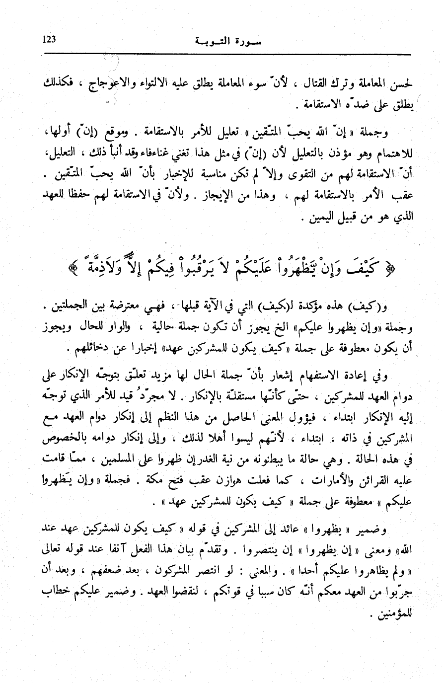 وَفِي إِعَادَةِ الِاسْتِفْهَامِ إِشْعَارٌ بِأَنَّ جُمْلَةَ الْحَالِ لَهَا مَزِيدُ تَعَلُّقٍ بِتَوَجُّهِ الْإِنْكَارِ عَلَى دَوَامِ الْعَهْدِ لِلْمُشْرِكِينَ، حَتَّى كَأَنَّهَا مُسْتَقِلَّةٌ بِالْإِنْكَارِ، لَا مُجَرَّدَ قَيْدٍ لِلْأَمْرِ الَّذِي تَوَجَّهَ إِلَيْهِ الْإِنْكَارُ ابْتِدَاءً، فَيَؤُولُ الْمَعْنَى الْحَاصِلُ مِنْ هَذَا النَّظْمِ إِلَى إِنْكَارِ دَوَامِ الْعَهْدِ مَعَ الْمُشْرِكِينَ فِي ذَاتِهِ، ابْتِدَاءً، لِأَنَّهُمْ لَيْسُوا أَهْلًا لِذَلِكَ، وَإِلَى إِنْكَارِ دَوَامِهِ بِالْخُصُوصِ فِي هَذِهِ الْحَالَةِ. وَهِيَ حَالَةُ مَا يُبْطِنُونَهُ مِنْ نِيَّةِ الْغَدْرِ إِنْ ظَهَرُوا عَلَى الْمُسْلِمِينَ، مِمَّا قَامَتْ عَلَيْهِ الْقَرَائِنُ وَالْأَمَارَاتُ، كَمَا فَعَلَتْ هَوَازِنُ عَقِبَ فَتْحِ مَكَّةَ. فَجُمْلَةُ: وَإِنْ يَظْهَرُوا عَلَيْكُمْ مَعْطُوفَةٌ عَلَى جُمْلَةِ كَيْفَ يَكُونُ لِلْمُشْرِكِينَ عَهْدٌ [التَّوْبَة: 7] .
